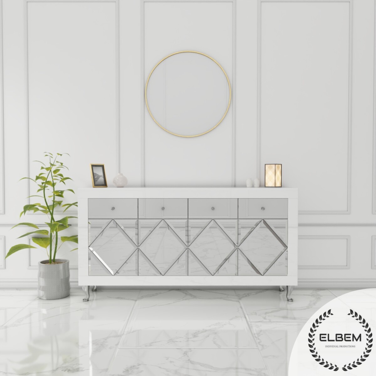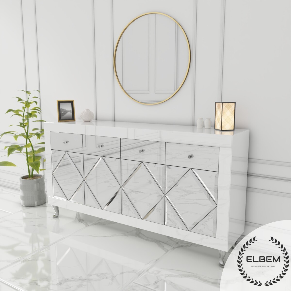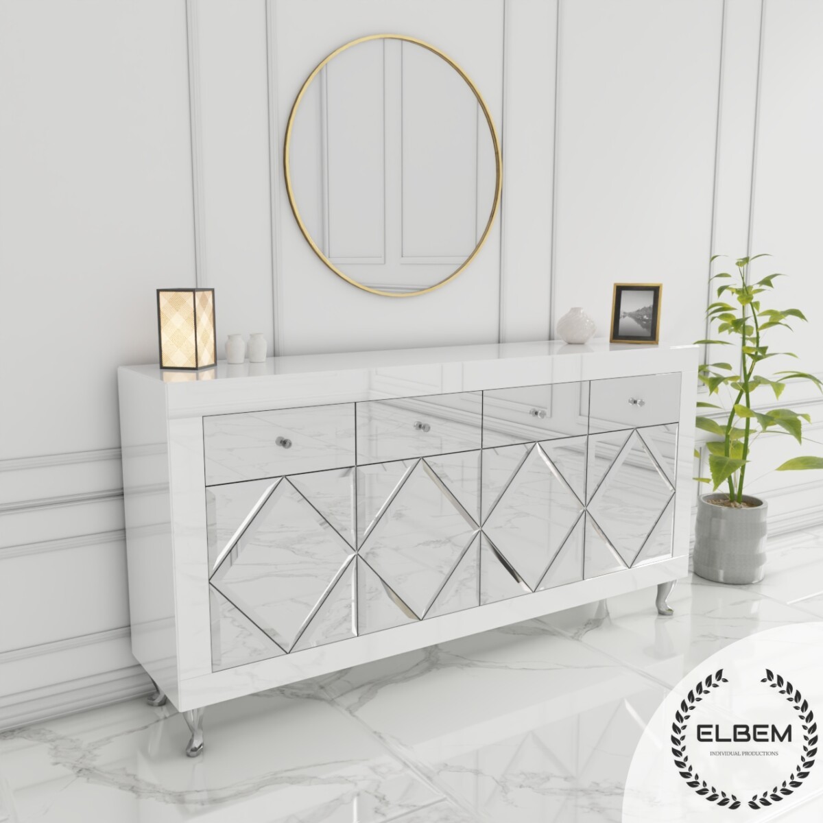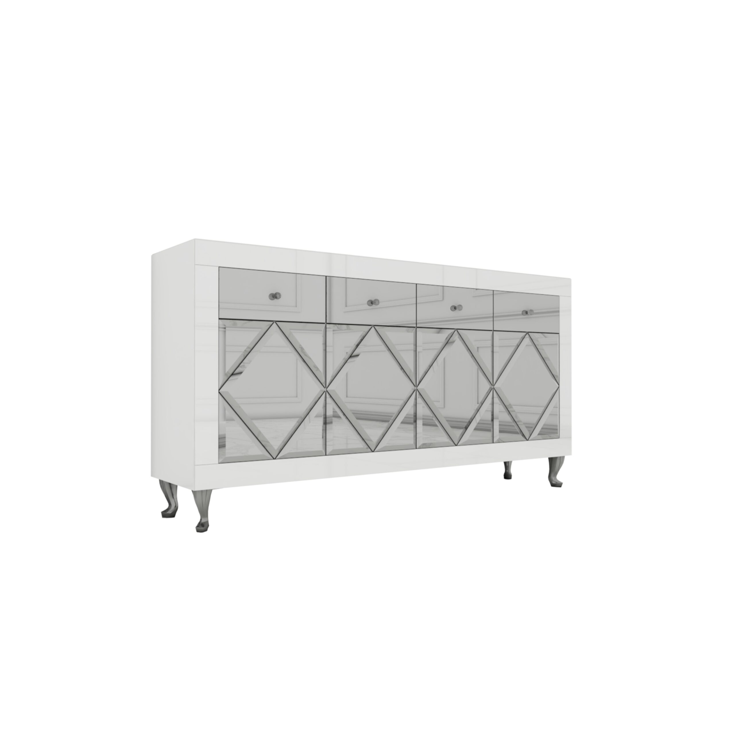 Szklana biała komoda w stylu Glamour z lustrzanymi drzwiczkami w kształcie rombów oraz czterema lustrzanymi szufladami to wyjątkowy mebel, który przyciąga uwagę swoim designerskim wyglądem i luksusowym charakterem.