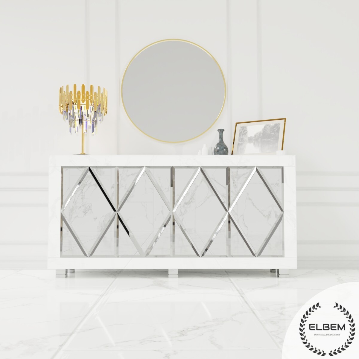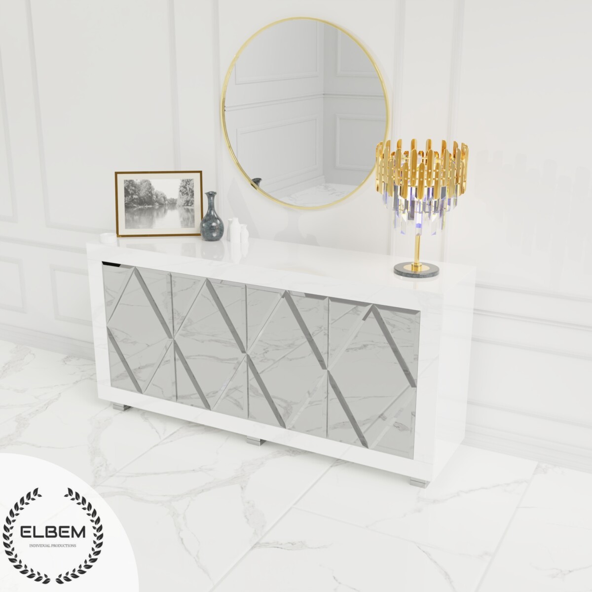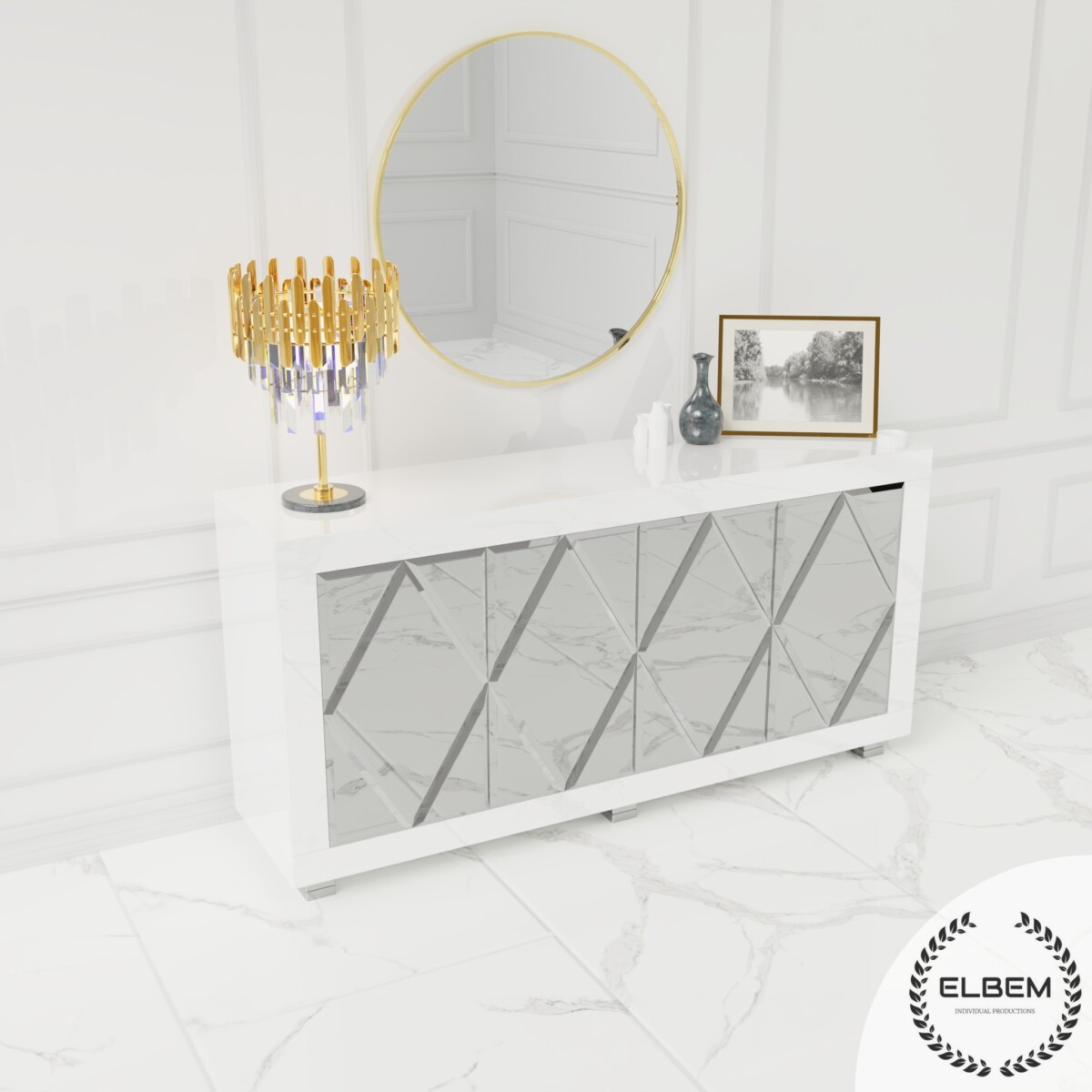 Szklana komoda z czterema drzwiczkami w ozdobne romby to designerski element, który dodaje elegancji i stylu Twojemu wnętrzu. Dzięki wyrafinowanym rombom na drzwiczkach, komoda staje się nie tylko praktycznym miejscem do przechowywania, ale także estetycznym akcentem. Szklane elementy nadają lekkości, a geometryczne wzory dodają subtelnej finezji, tworząc harmonijne połączenie funkcji i designu w jednym.