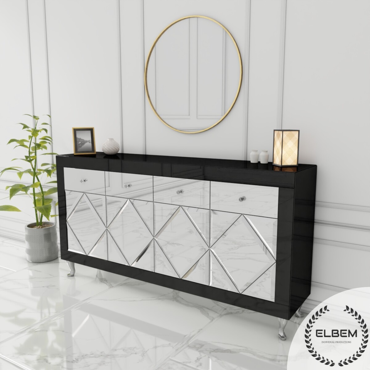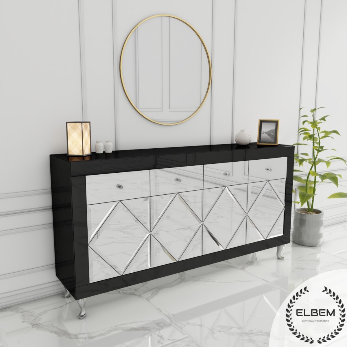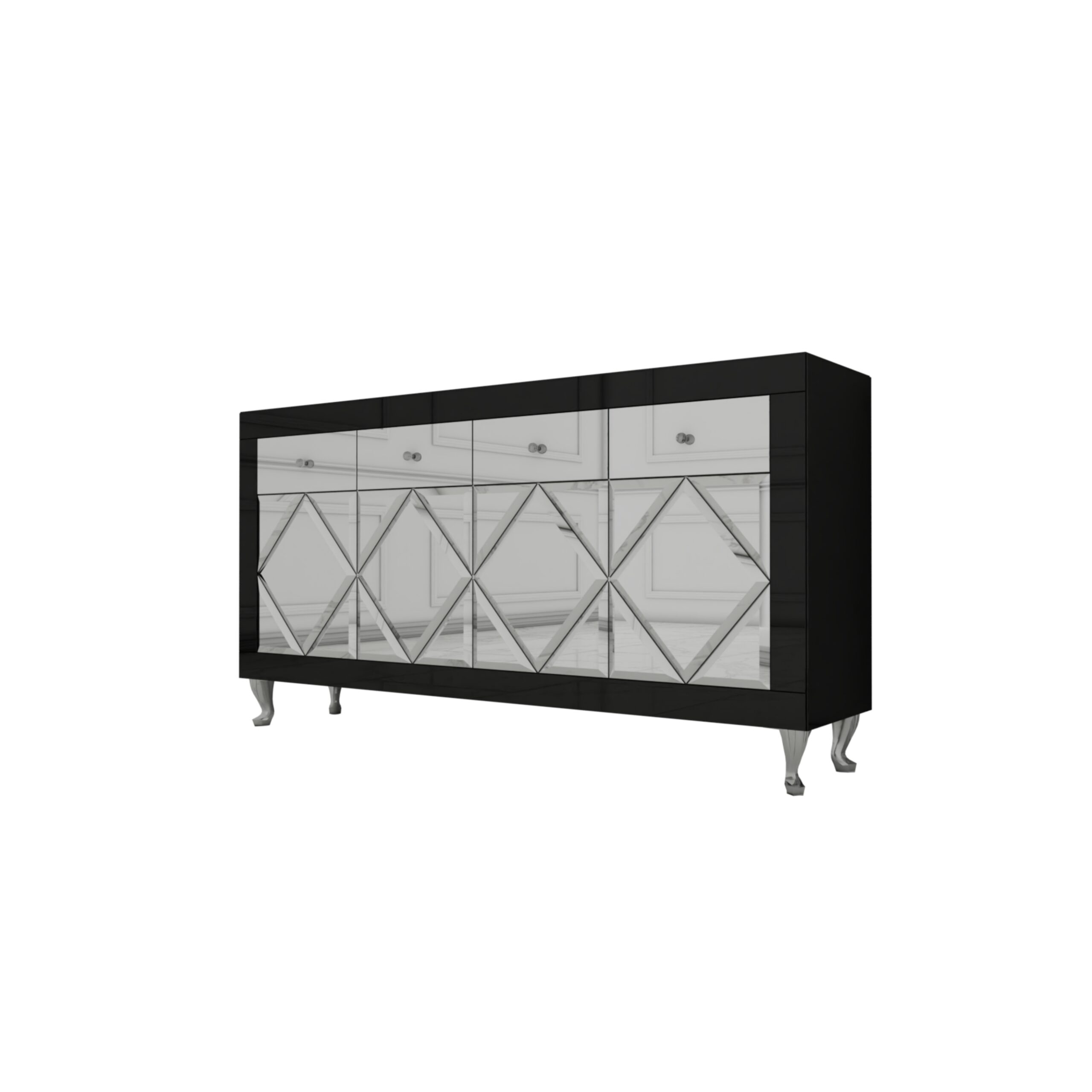 Szklana czarna komoda w stylu Glamour z lustrzanymi drzwiczkami w kształcie rombów oraz czterema lustrzanymi szufladami to wyjątkowy mebel, który przyciąga uwagę swoim designerskim wyglądem i luksusowym charakterem.