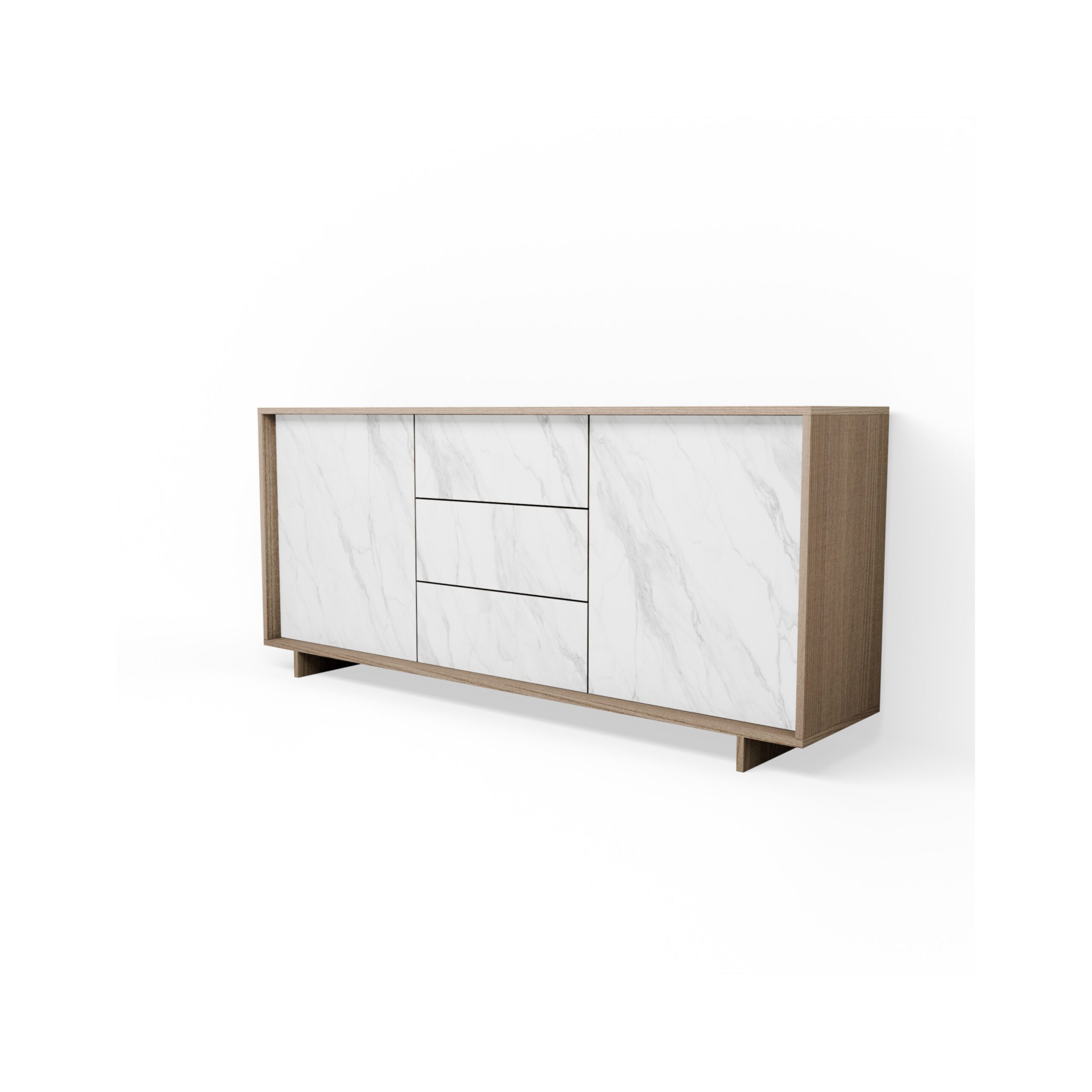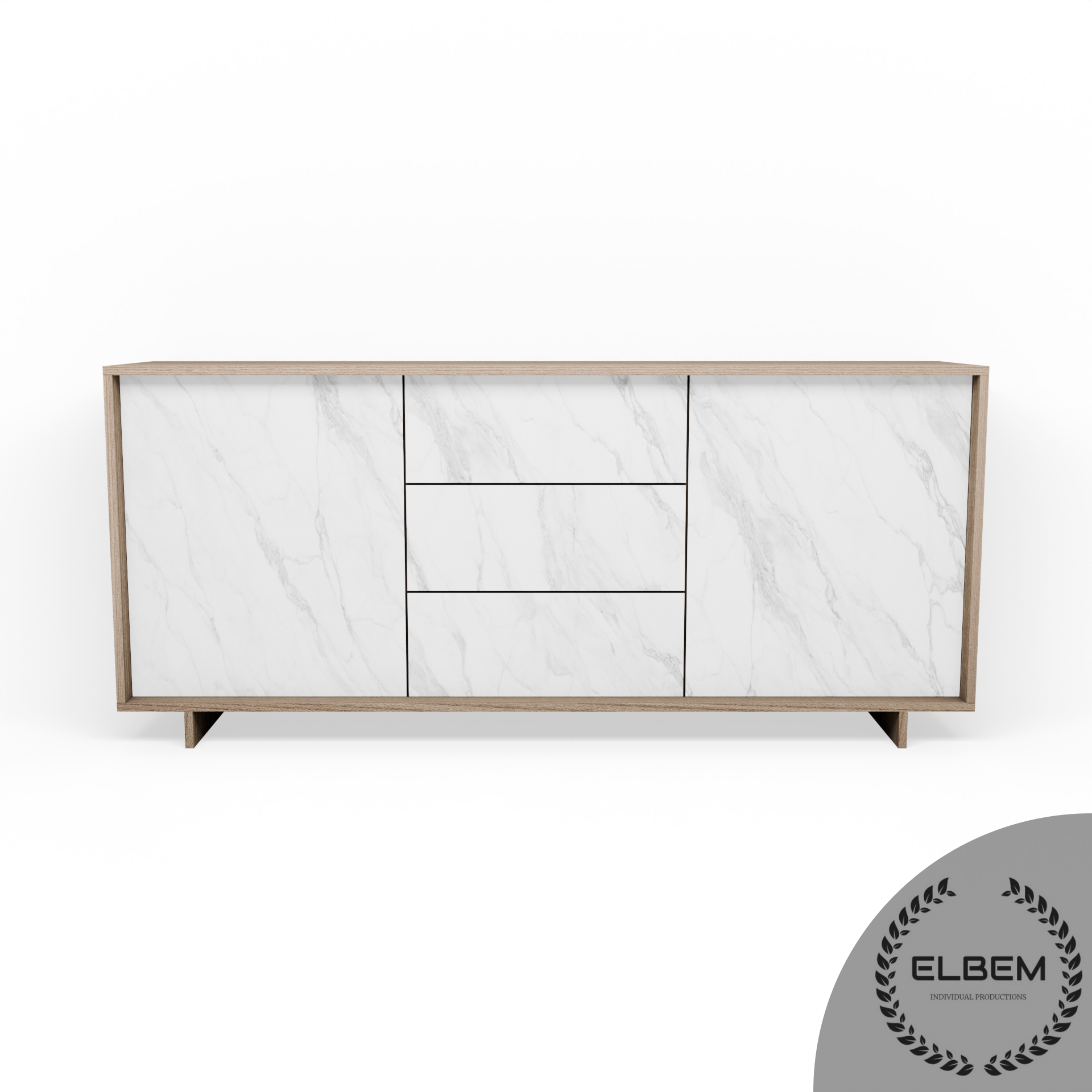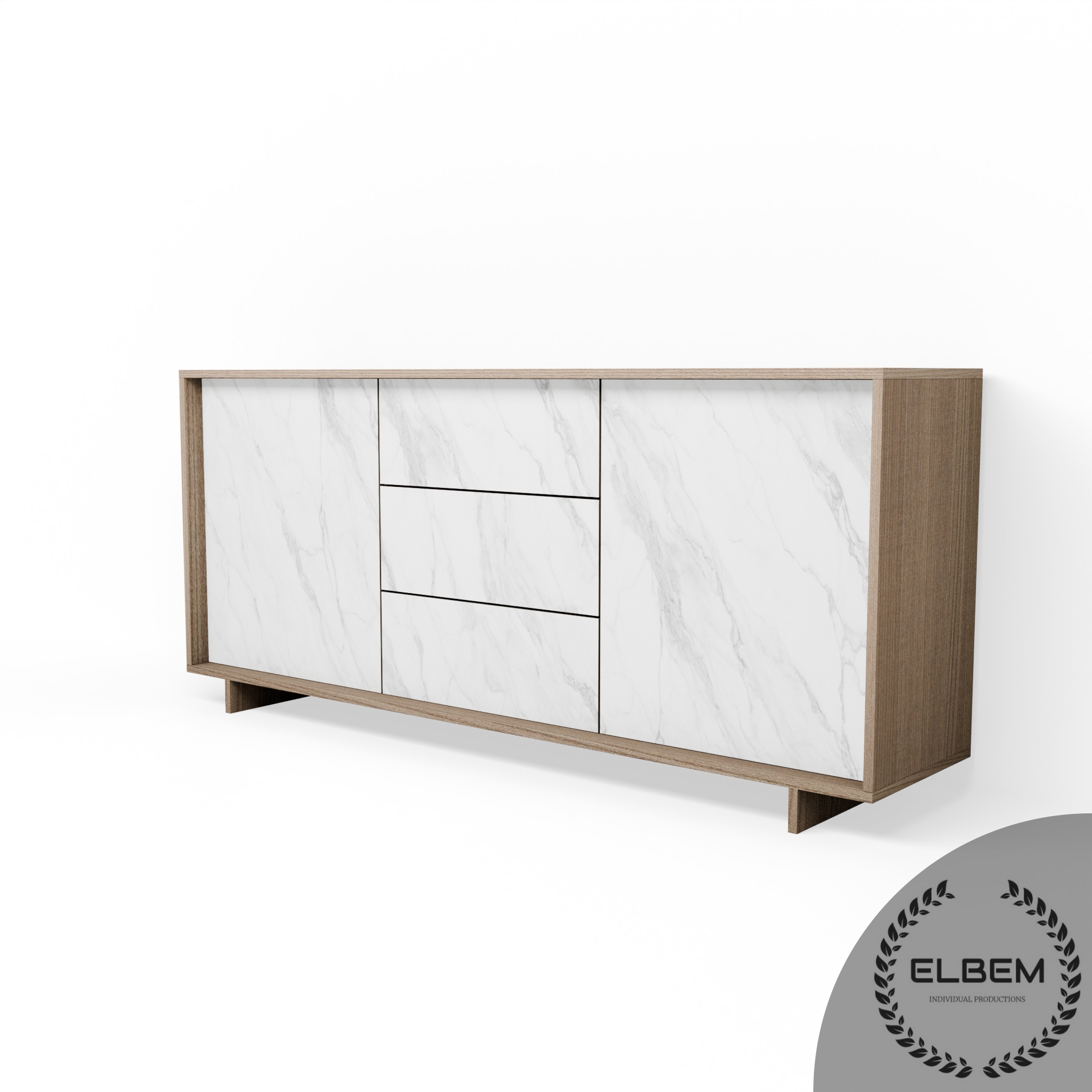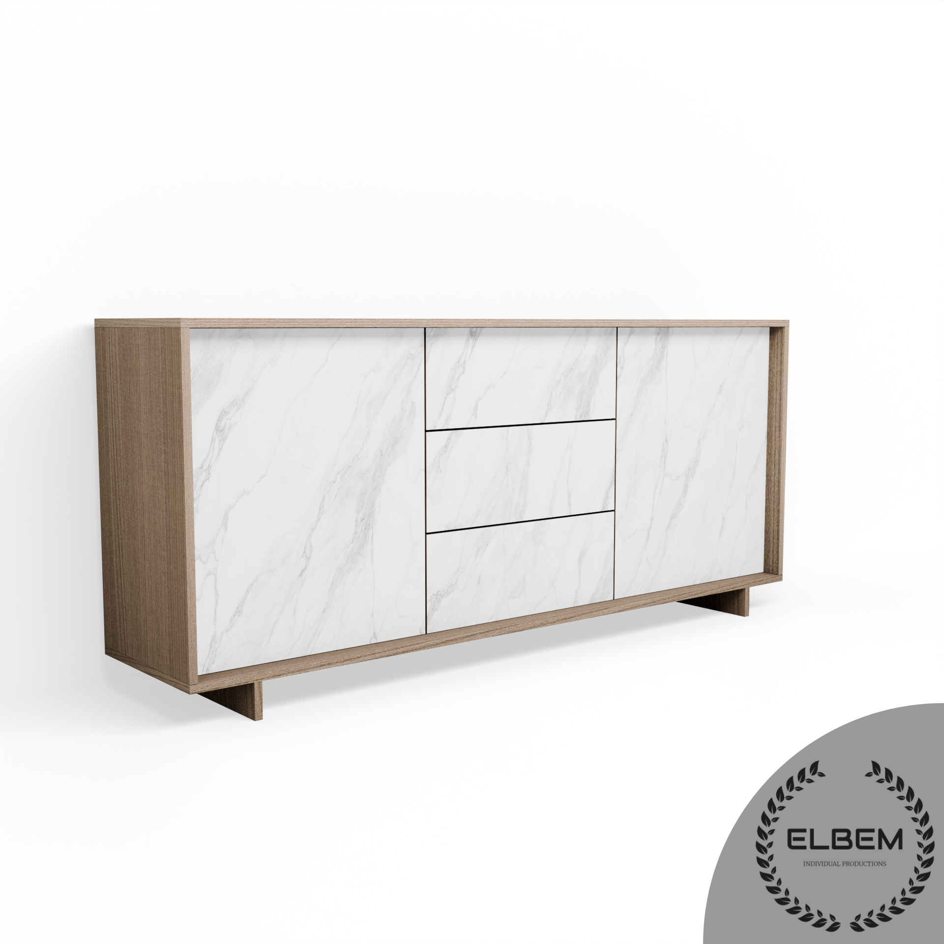 Elegancka komoda wykonana z wysokiej jakości płyty laminowanej w dekorze Olmo Jerez, wyróżnia się nowoczesnym stylem i solidnym wykończeniem. Dwa fronty z białego, szklanego marmuru nadają jej wyjątkowego charakteru oraz trzy praktyczne szuflady dodają luksusowego wyglądu. System otwierania na dotyk (push-to-open) zapewnia wygodę użytkowania i podkreśla minimalistyczny design. Idealna do stylowego salonu.