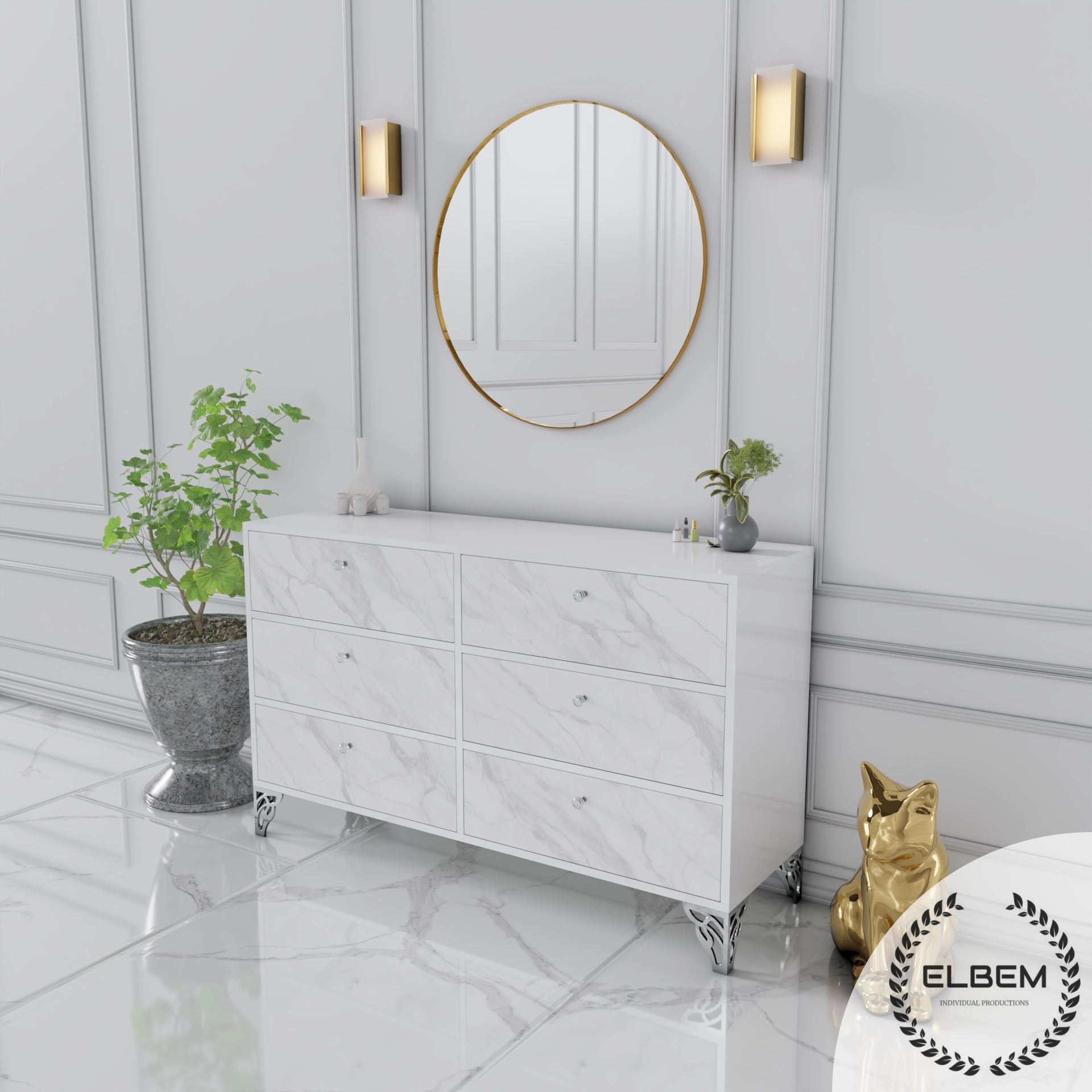 Elegancka komoda w białym połysku z wykonanymi frontami z białego szklanego marmuru złamie monotonię Twojego salonu, dodając mu wyjątkowego blasku i stylu. Wykonana z wysokiej jakości materiałów, gwarantuje trwałość i solidność na lata. Delikatne złote nóżki podkreślają elegancję mebla, nadając mu subtelnego uroku.