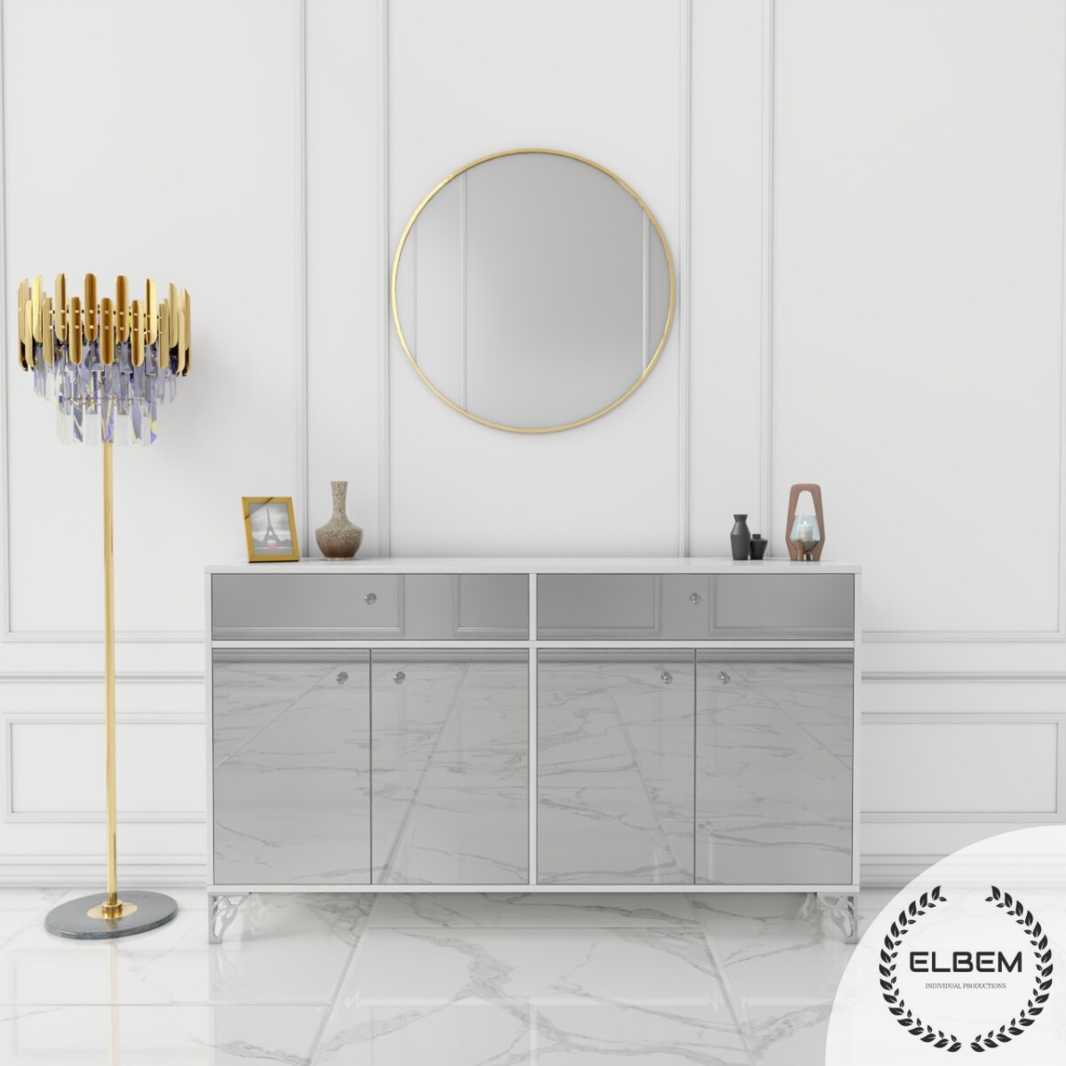 Komoda biały połysk – szklany srebrny front Glamour ELARIA SILVER
