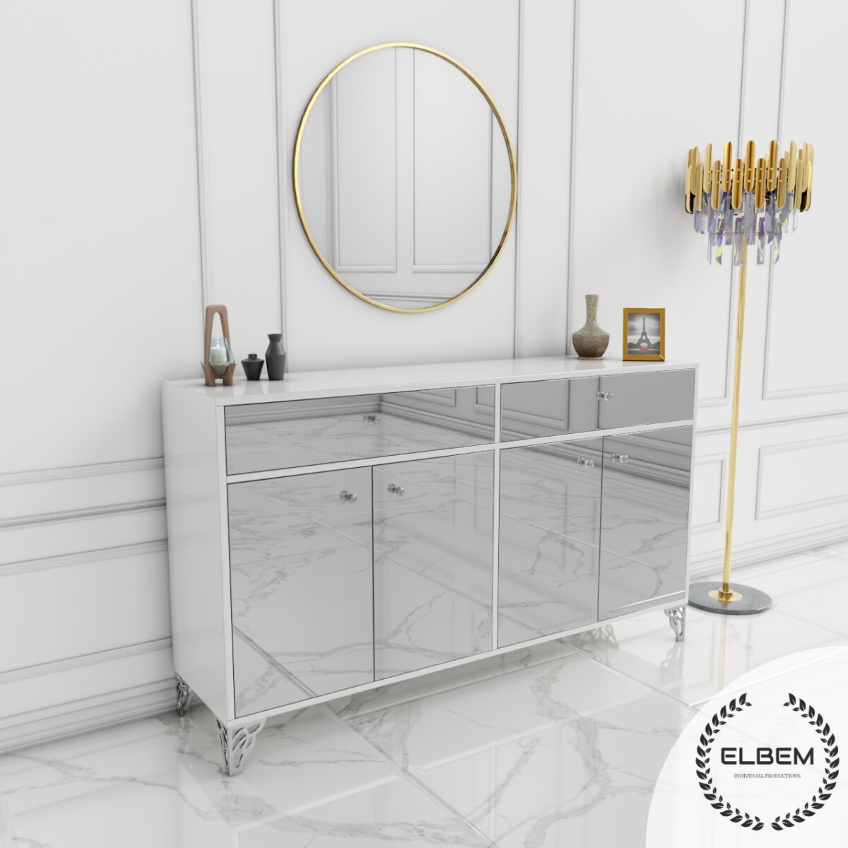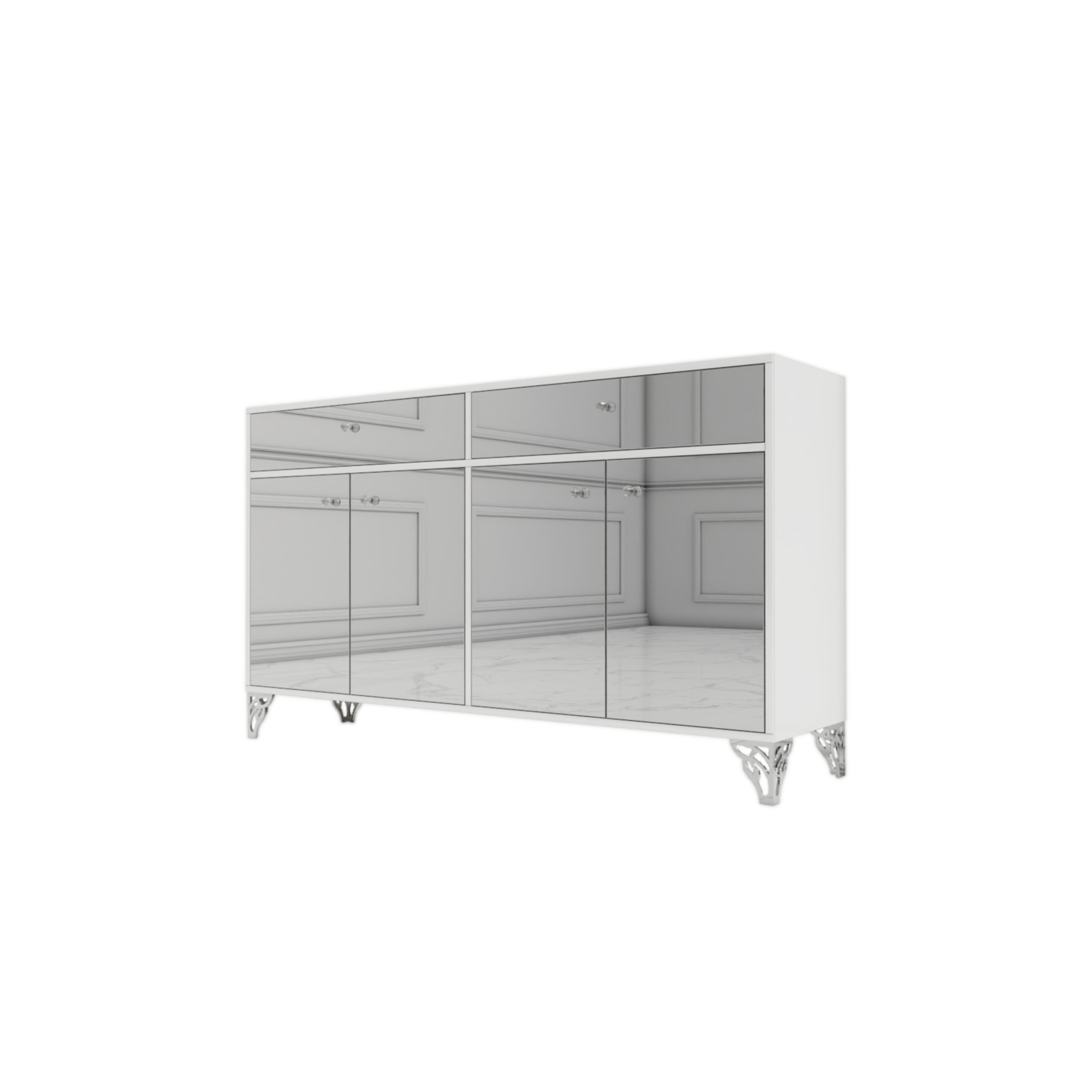 Elegancka komoda w białym połysku z wykonanymi lustrzanymi frontami złamie monotonię Twojego salonu, dodając mu wyjątkowego blasku i stylu. Wykonana z wysokiej jakości materiałów, gwarantuje trwałość i solidność na lata. Delikatne srebrne nóżki podkreślają elegancję mebla, nadając mu subtelnego uroku.