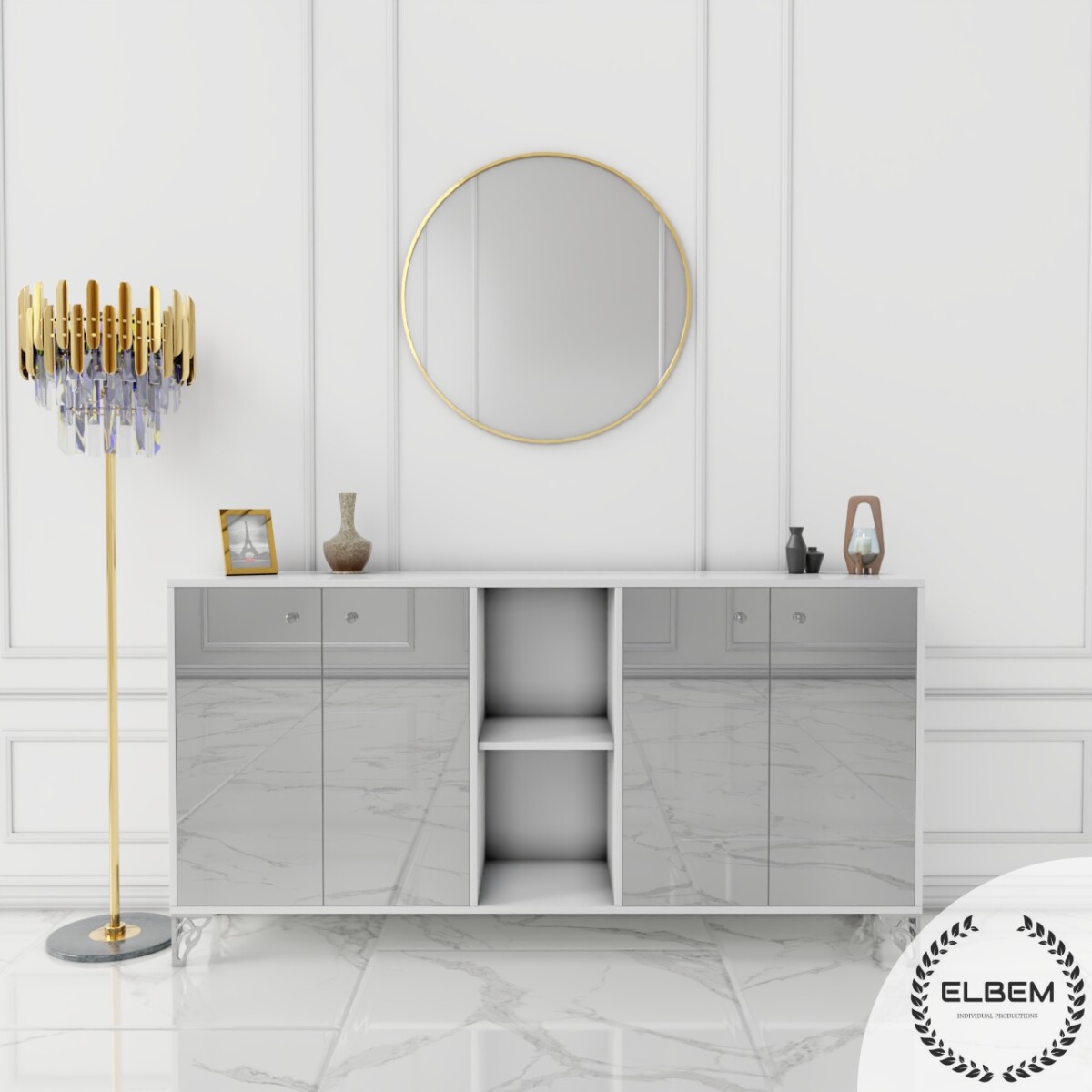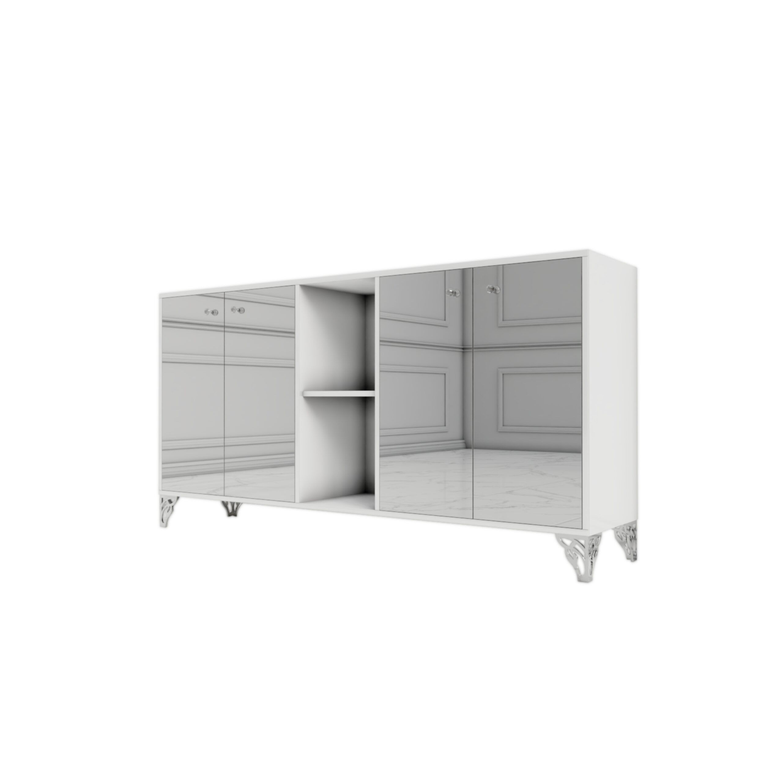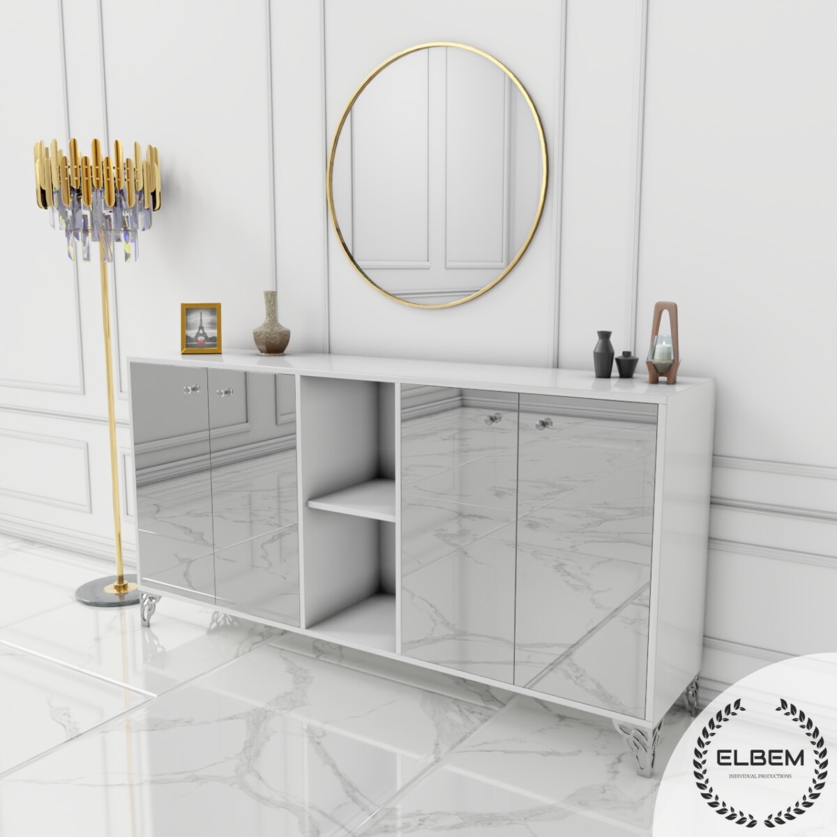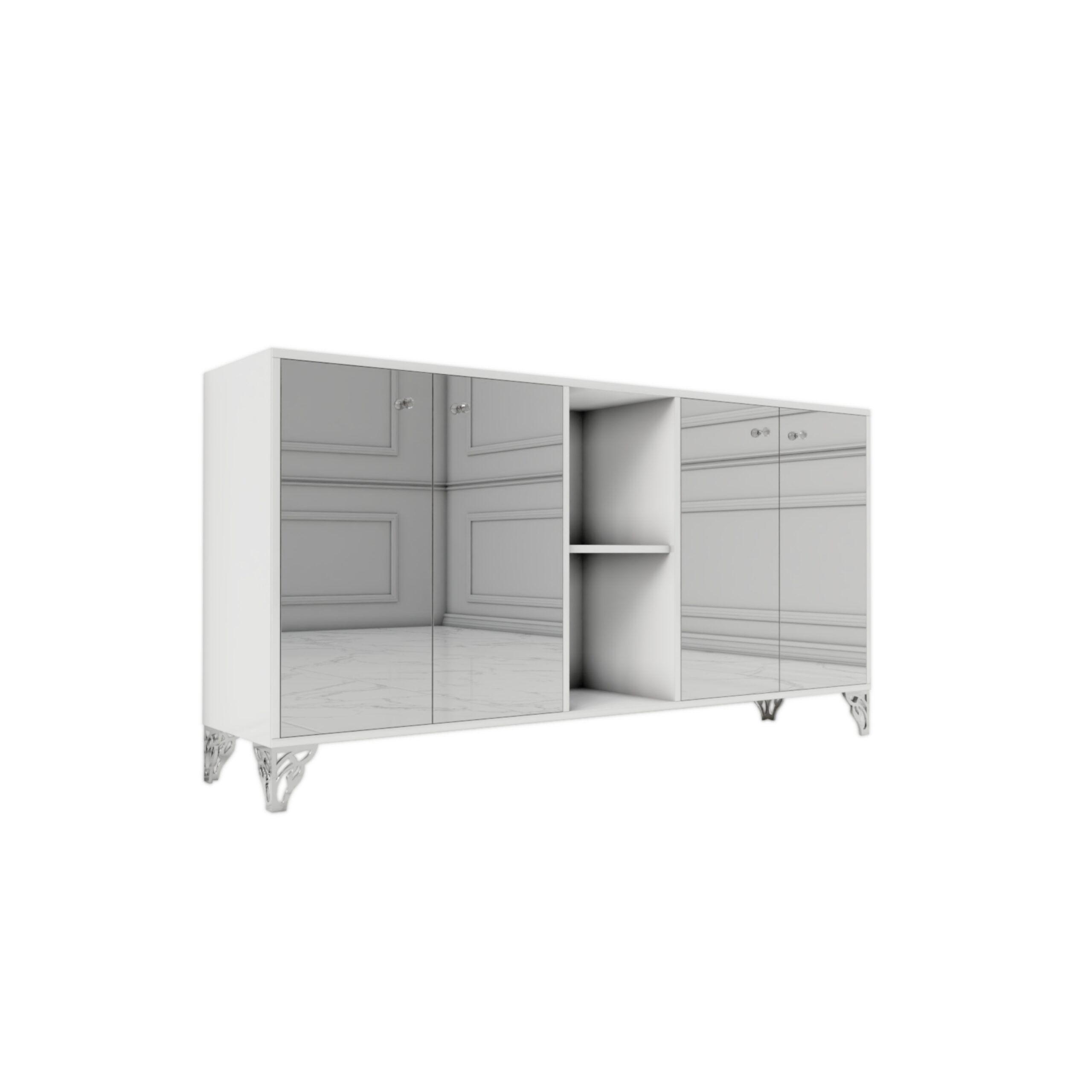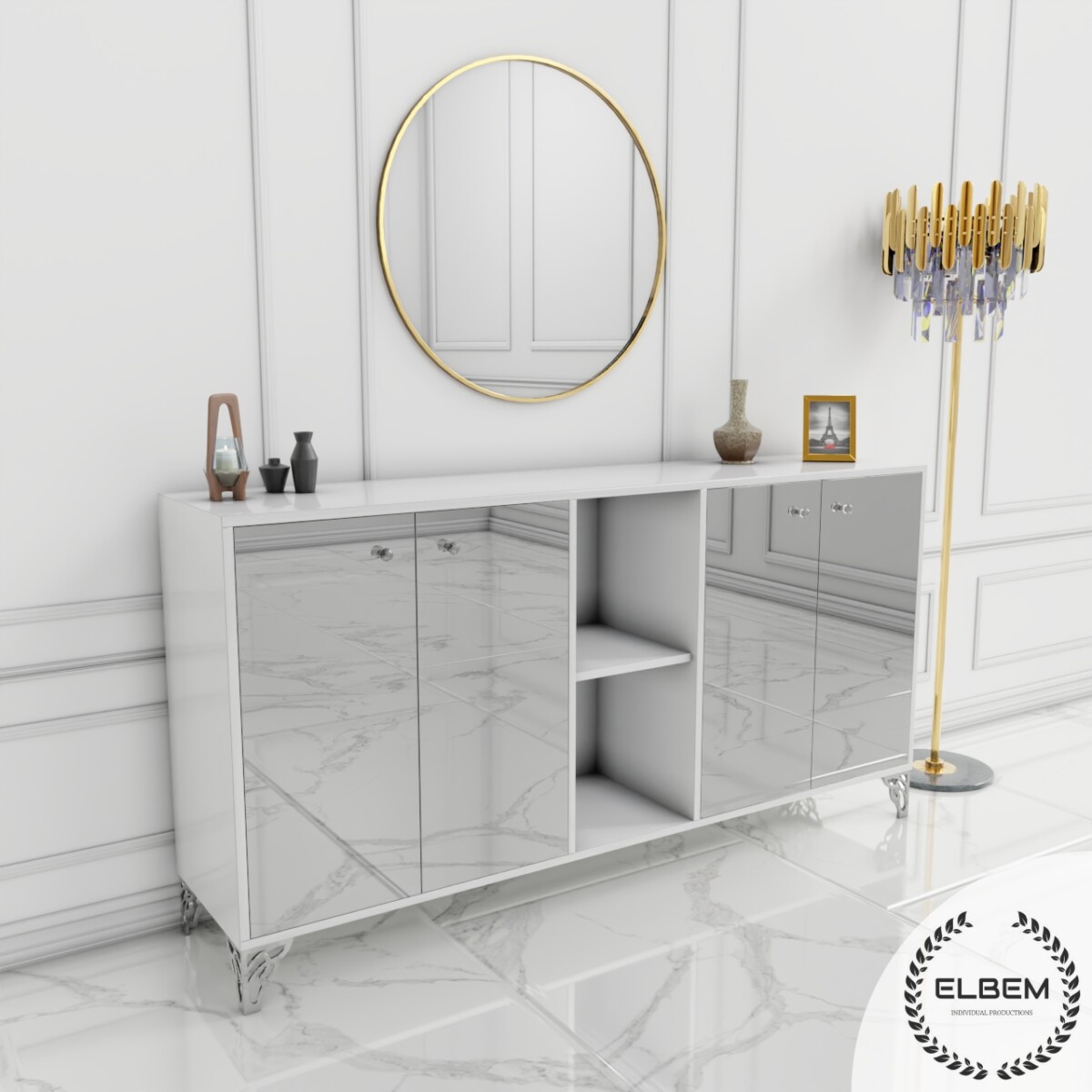 Elegancka komoda w białym połysku z wykonanymi lustrzanymi frontami złamie monotonię Twojego salonu, dodając mu wyjątkowego blasku i stylu. Wykonana z wysokiej jakości materiałów, gwarantuje trwałość i solidność na lata. Delikatne srebrne nóżki podkreślają elegancję mebla, nadając mu subtelnego uroku.