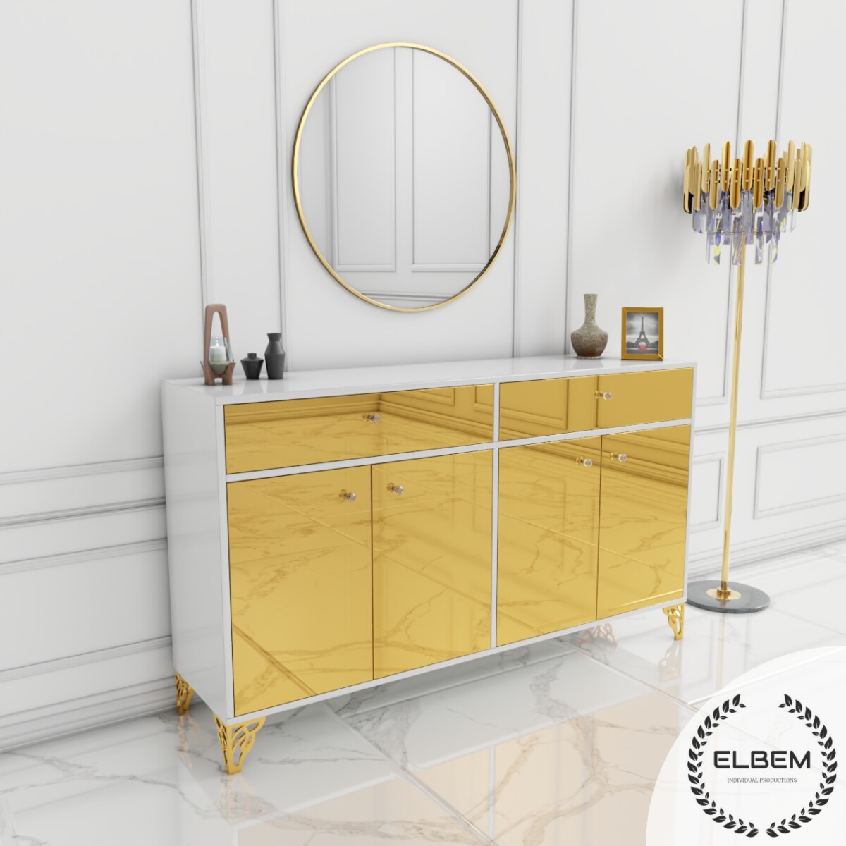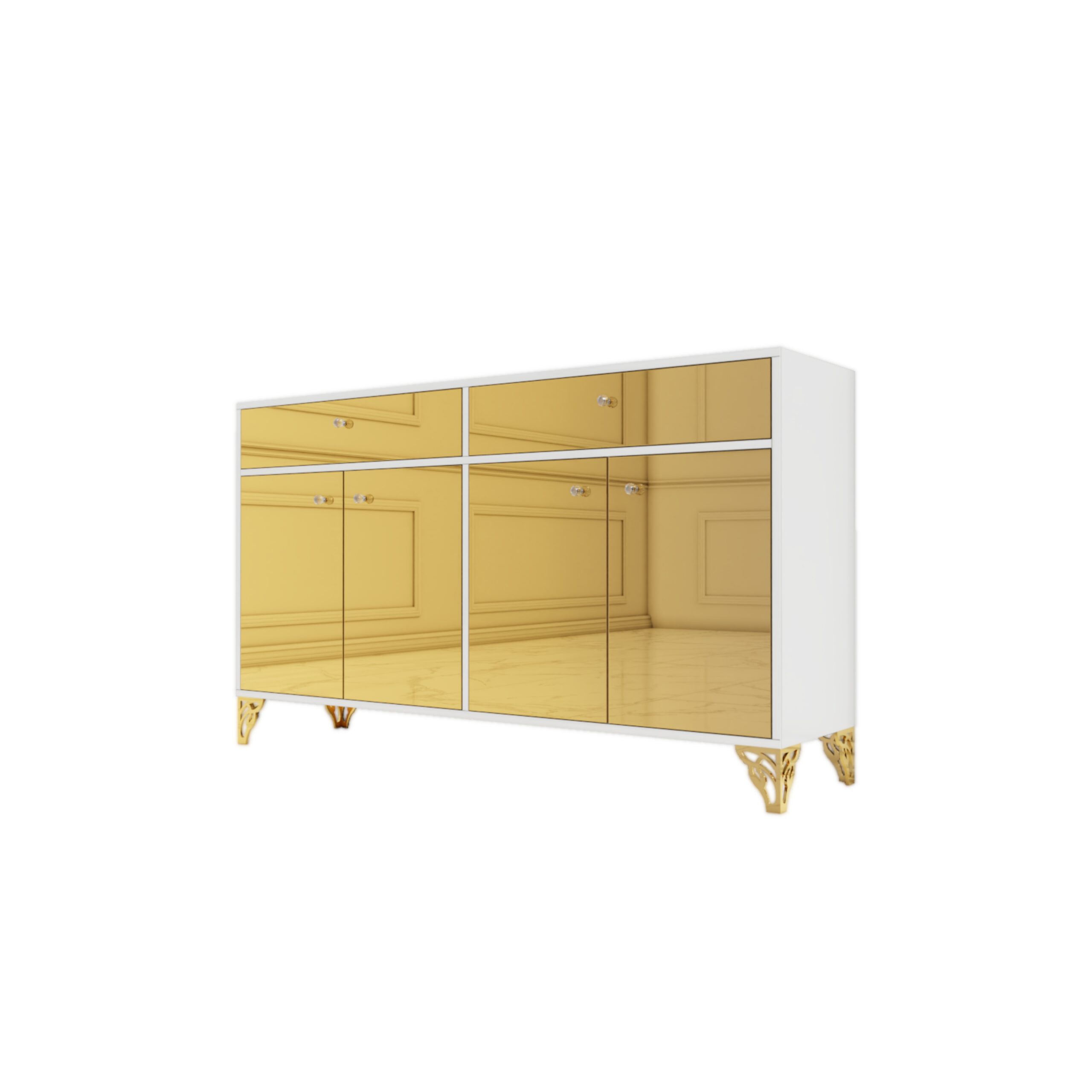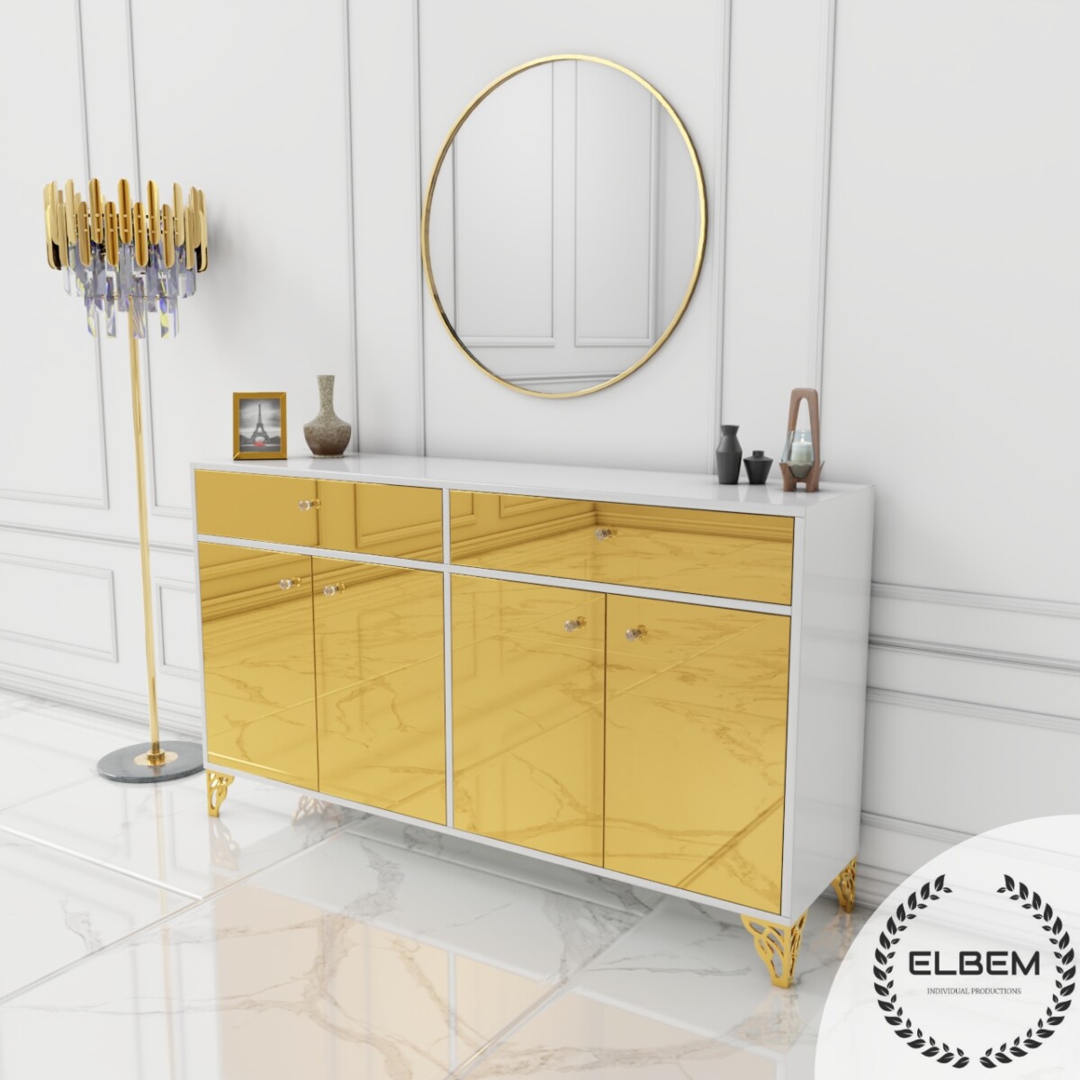 Komoda biały połysk – szklany złoty front Glamour ELARIA GOLD