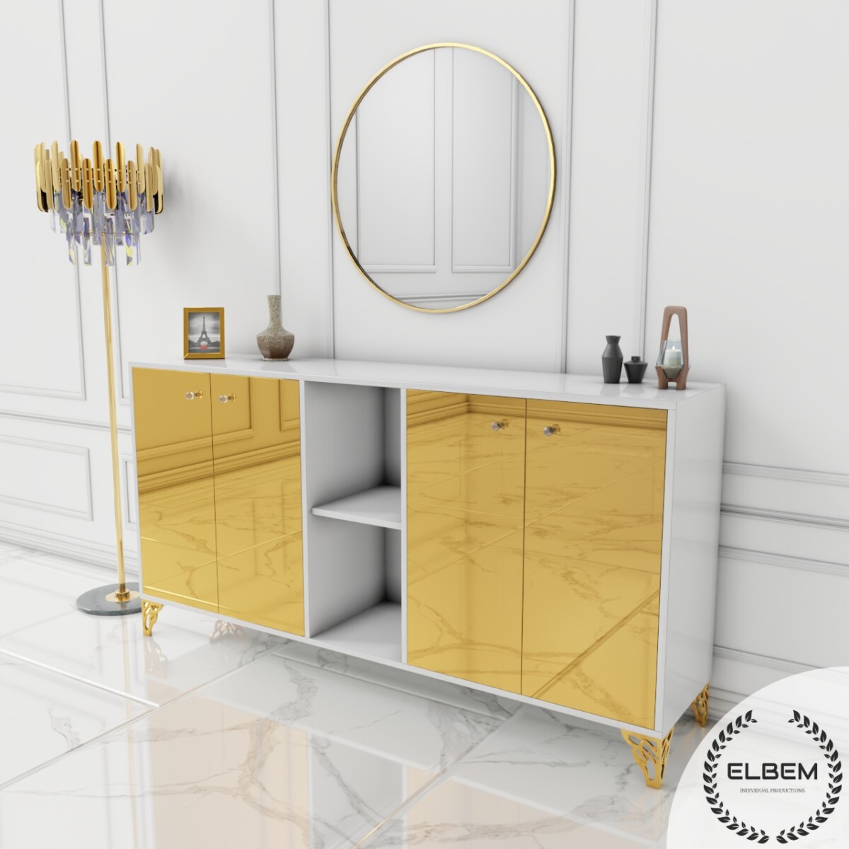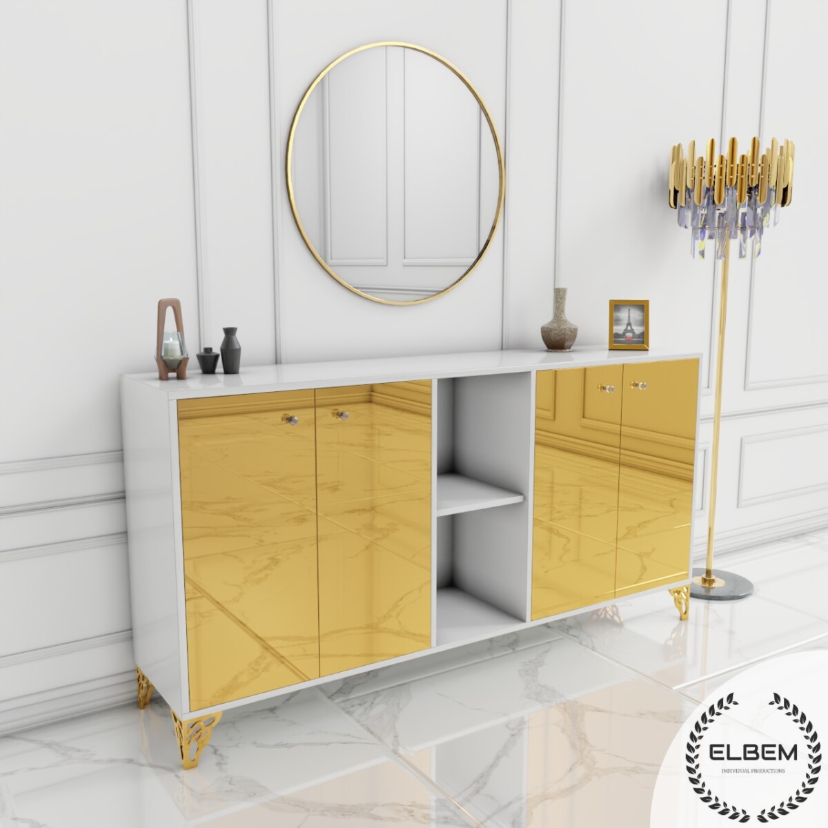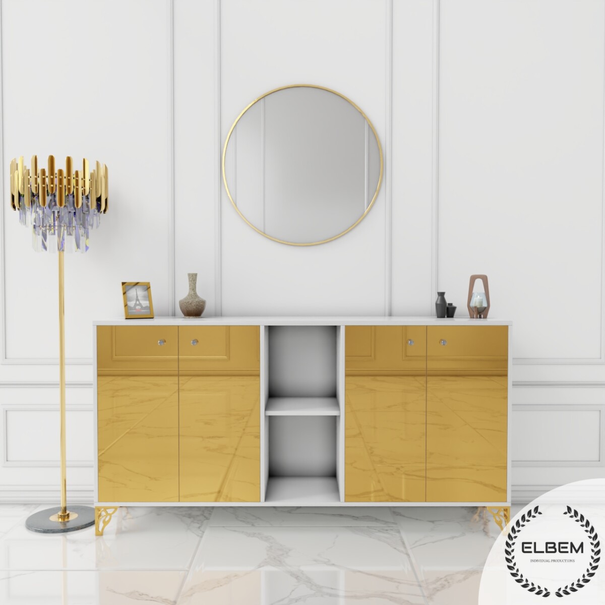 Elegancka komoda w białym połysku z wykonanymi lustrzanymi frontami złamie monotonię Twojego salonu, dodając mu wyjątkowego blasku i stylu. Wykonana z wysokiej jakości materiałów, gwarantuje trwałość i solidność na lata. Delikatne złote nóżki podkreślają elegancję mebla, nadając mu subtelnego uroku.