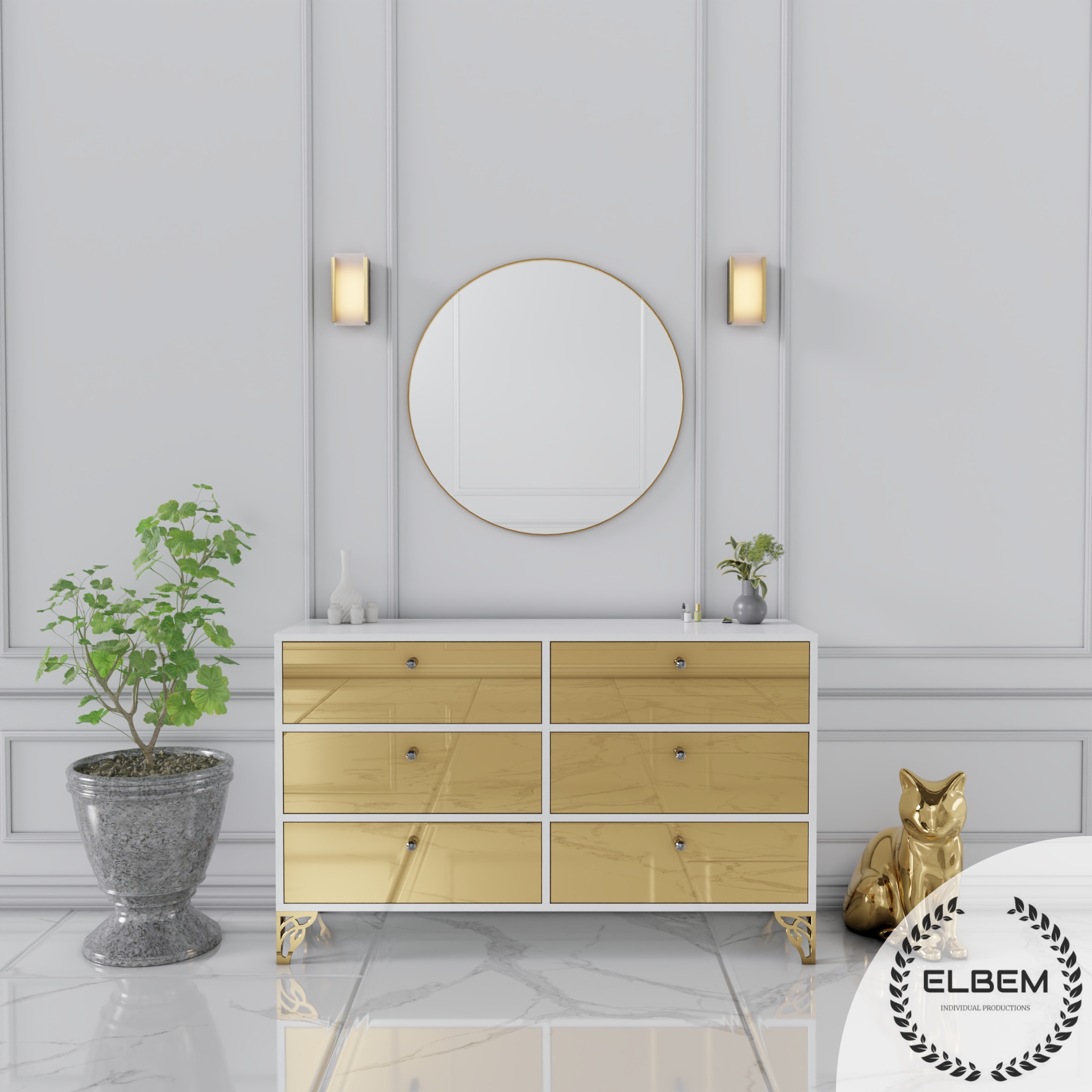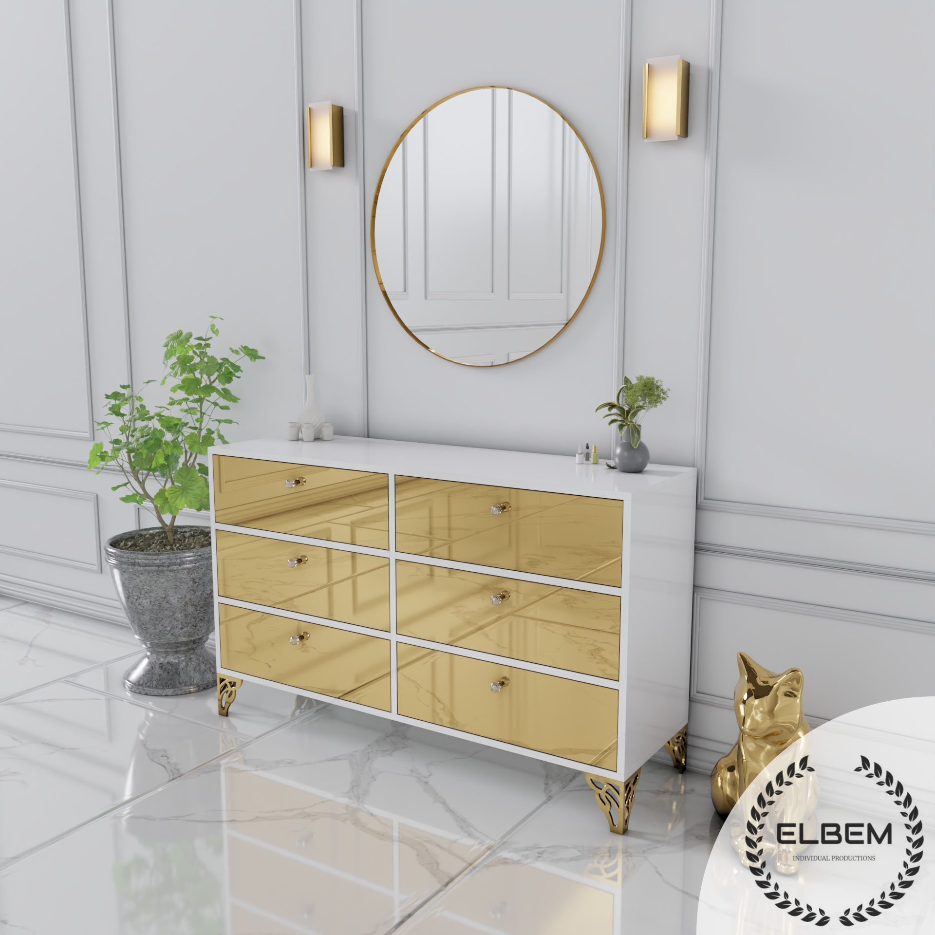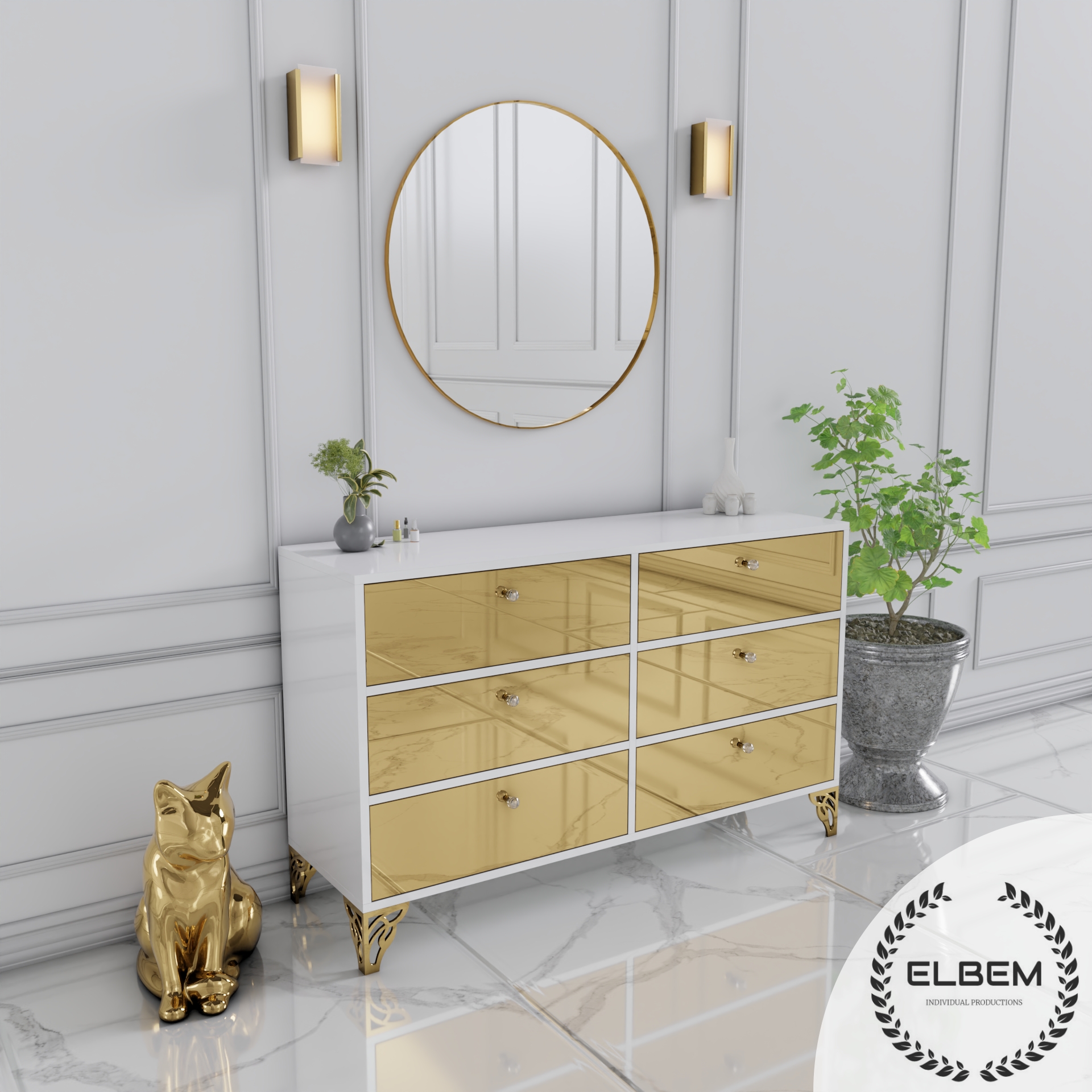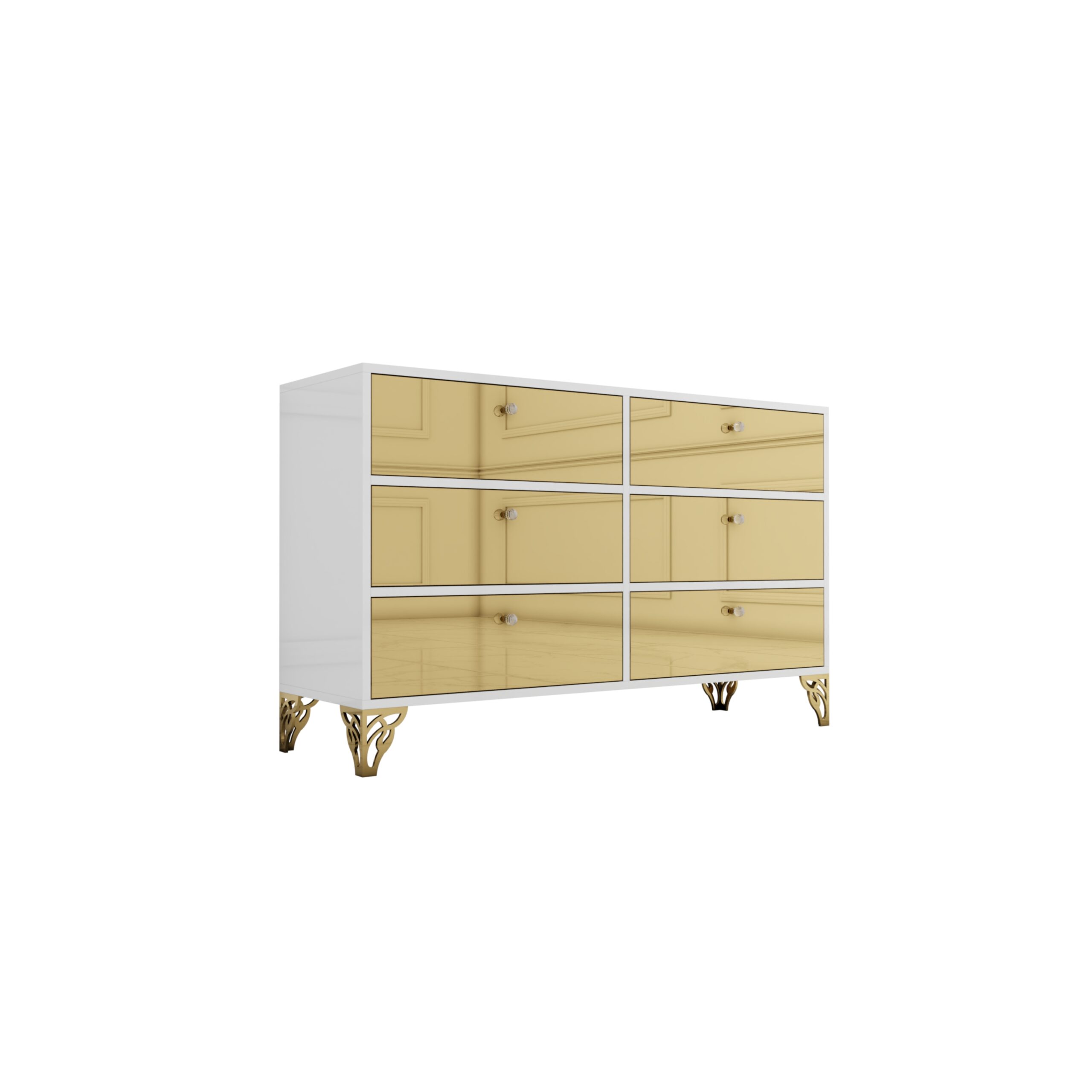 Elegancka komoda w białym połysku z wykonanymi lustrzanymi złotymi frontami złamie monotonię Twojego salonu, dodając mu wyjątkowego blasku i stylu. Wykonana z wysokiej jakości materiałów, gwarantuje trwałość i solidność na lata. Delikatne złote nóżki podkreślają elegancję mebla, nadając mu subtelnego uroku.