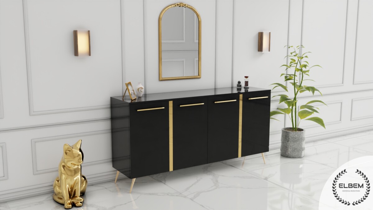 Komoda Glamour zaprojektowana w eleganckim stylu, w połączeniu czarnego lakieru w połysku.  Mebel jest funkcjonalny, posiada dużo przestrzeni do przechowywania. Wyposażona została w cztery pojemne drzwiczki. Sprawdzi się jako ozdoba twojego salonu, sypialni jak i dekoracja przedpokoju.