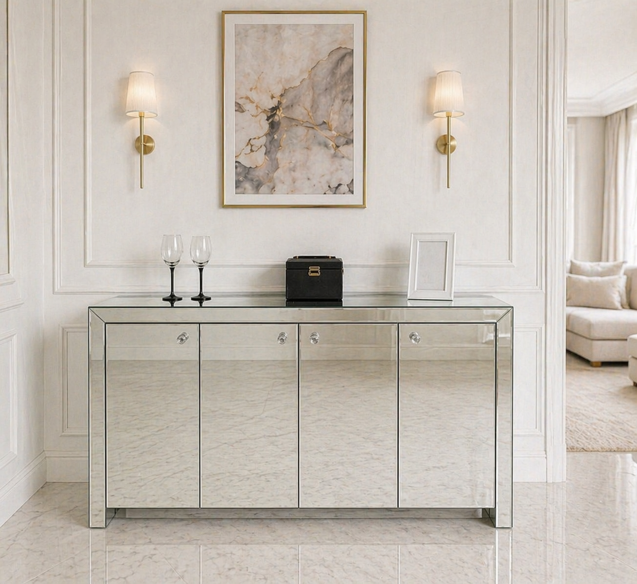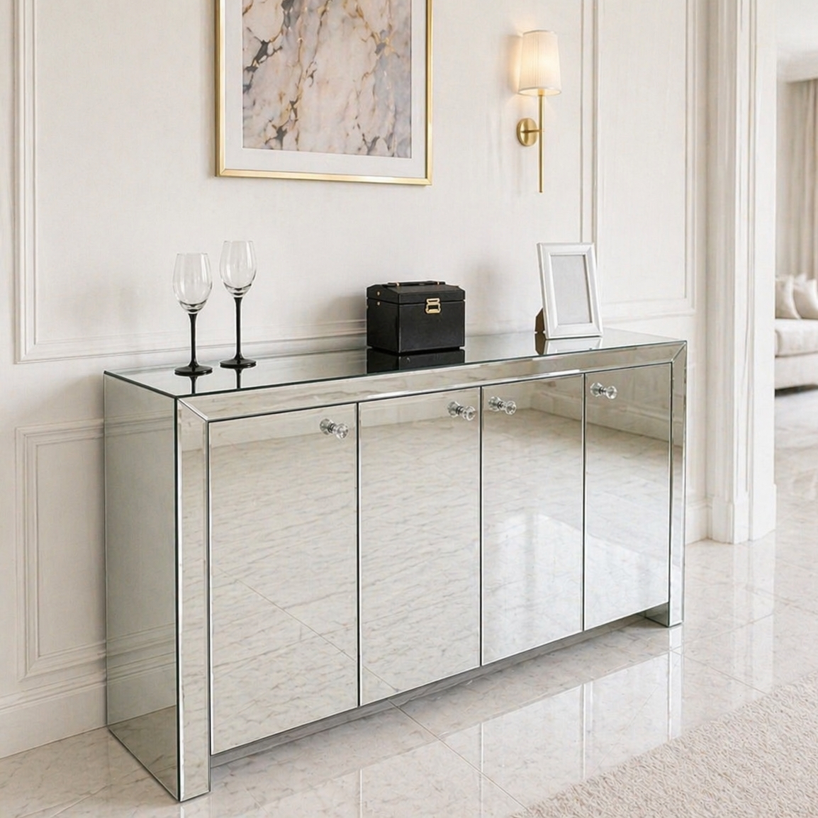 Lustrzana komoda w stylu Glamour z lustrzanymi drzwiczkami to wyjątkowy mebel, który przyciąga uwagę swoim designerskim wyglądem i luksusowym charakterem.