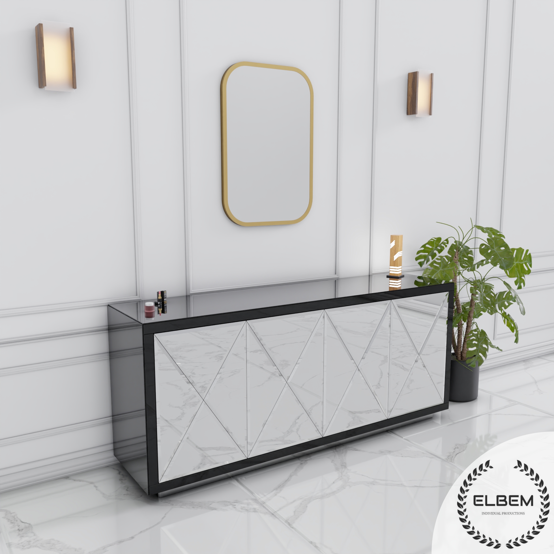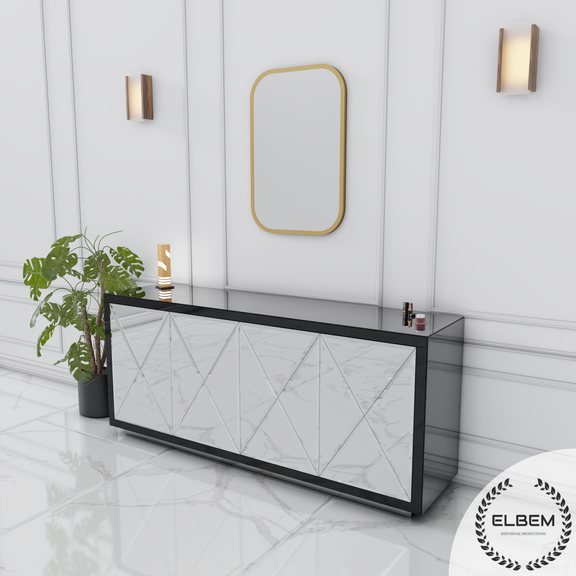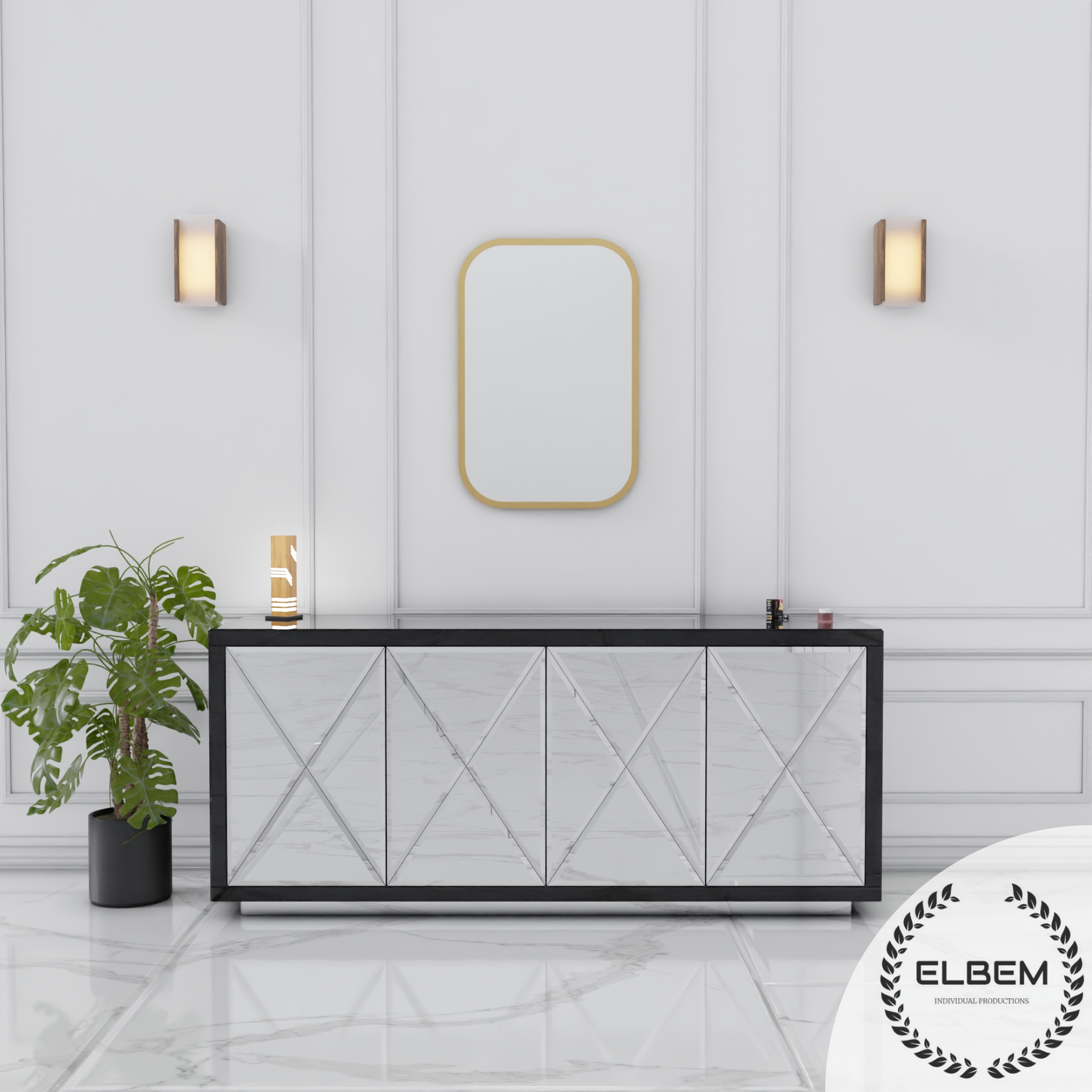 Szklana czarna komoda w stylu Glamour z lustrzanymi drzwiczkami w kształcie IKSÓW to wyjątkowy mebel, który przyciąga uwagę swoim designerskim wyglądem i luksusowym charakterem.