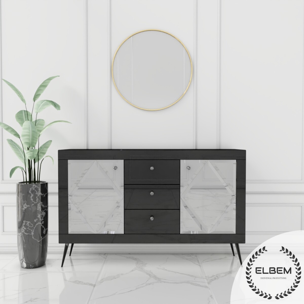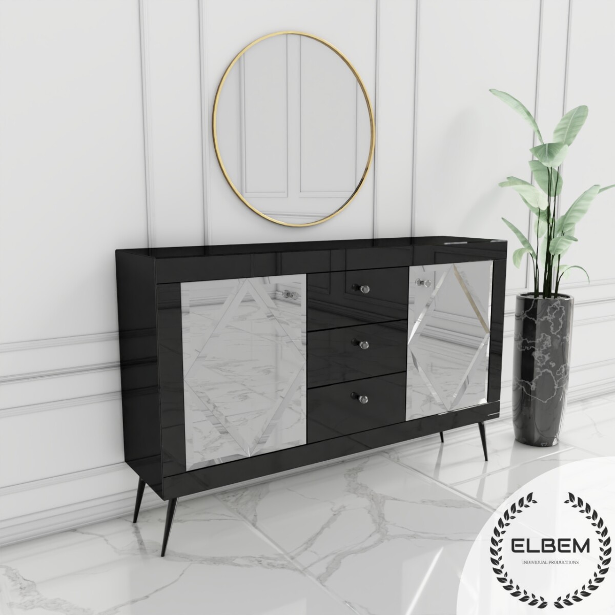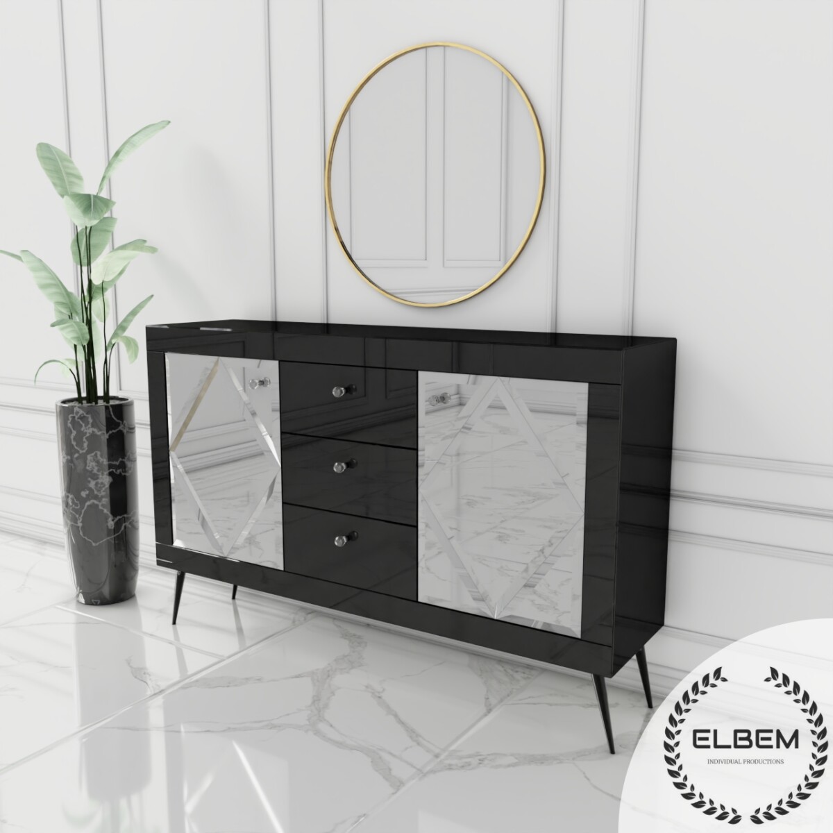 Szklana czarna komoda w stylu Glamour z lustrzanymi drzwiczkami w kształcie rombów oraz trzema czarnymi szufladami to wyjątkowy mebel, który przyciąga uwagę swoim designerskim wyglądem i luksusowym charakterem.