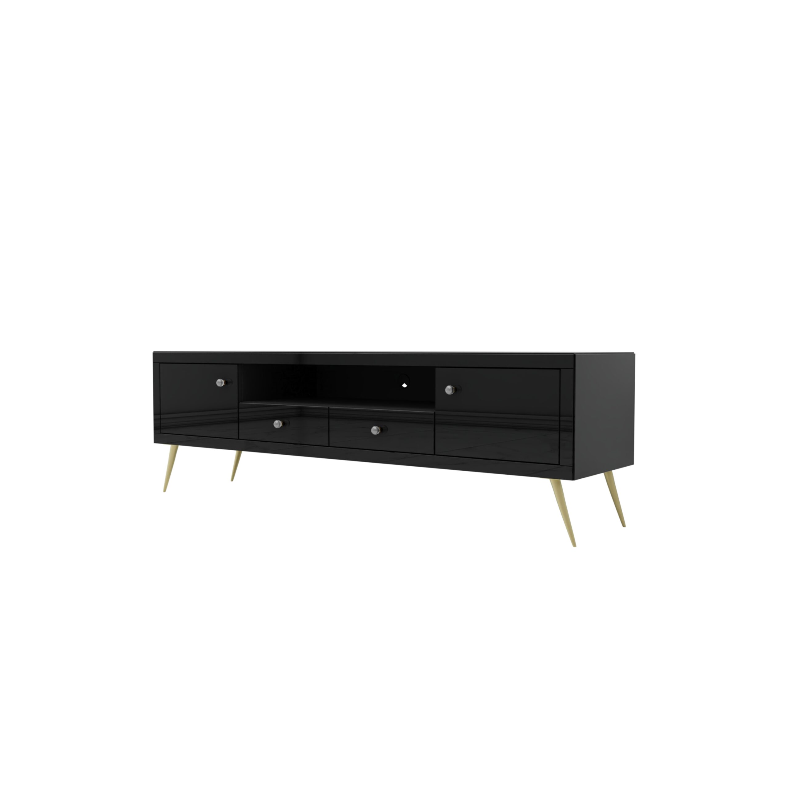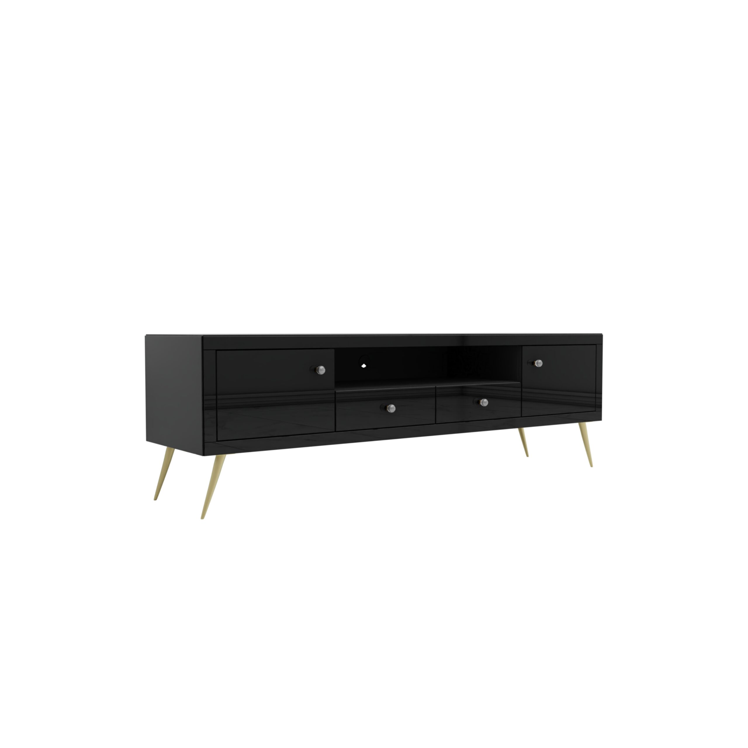 Piękna Szklana czarna szafka RTV Glamour, która posiada dwie szuflady pośrodku oraz dwie szafki po bokach. Ta elegancka szafka stoi na metalowych skośnych nóżkach a dopełnieniem elegancji są uchwyty kryształkowe.