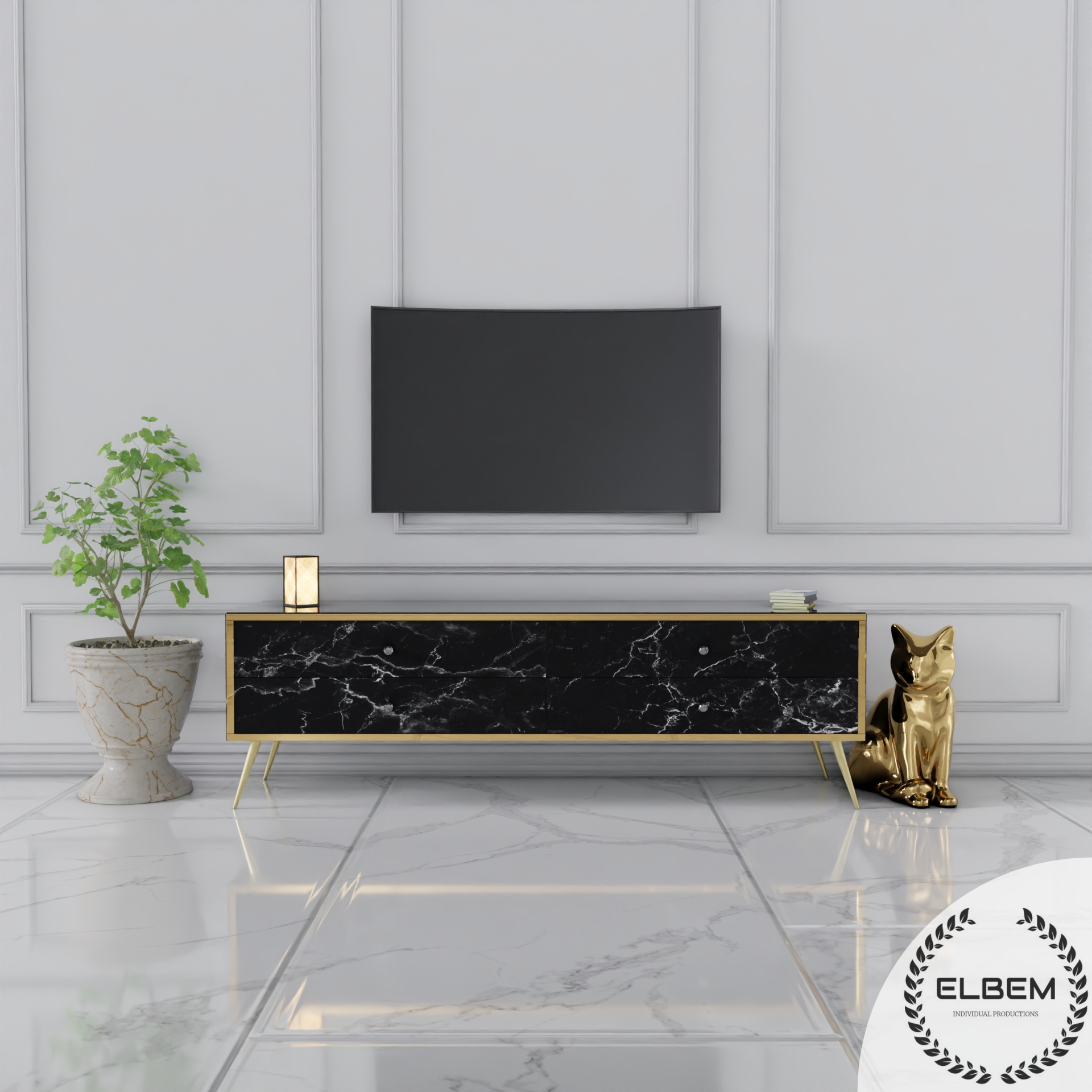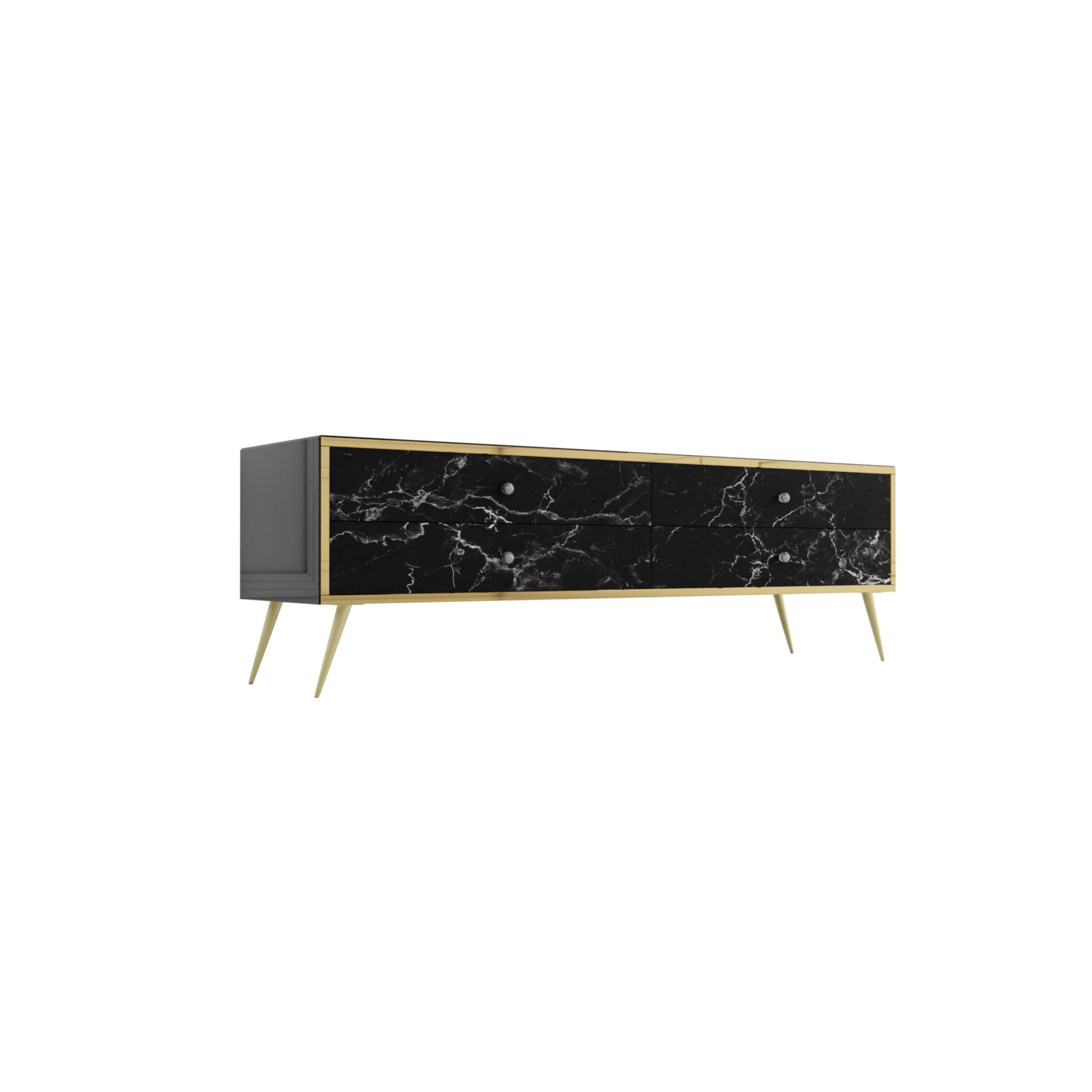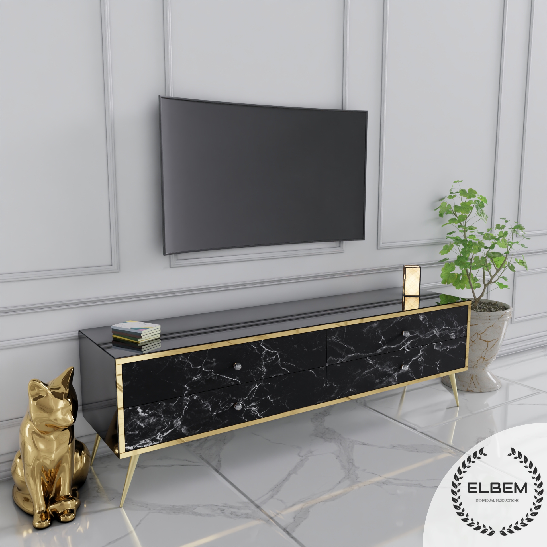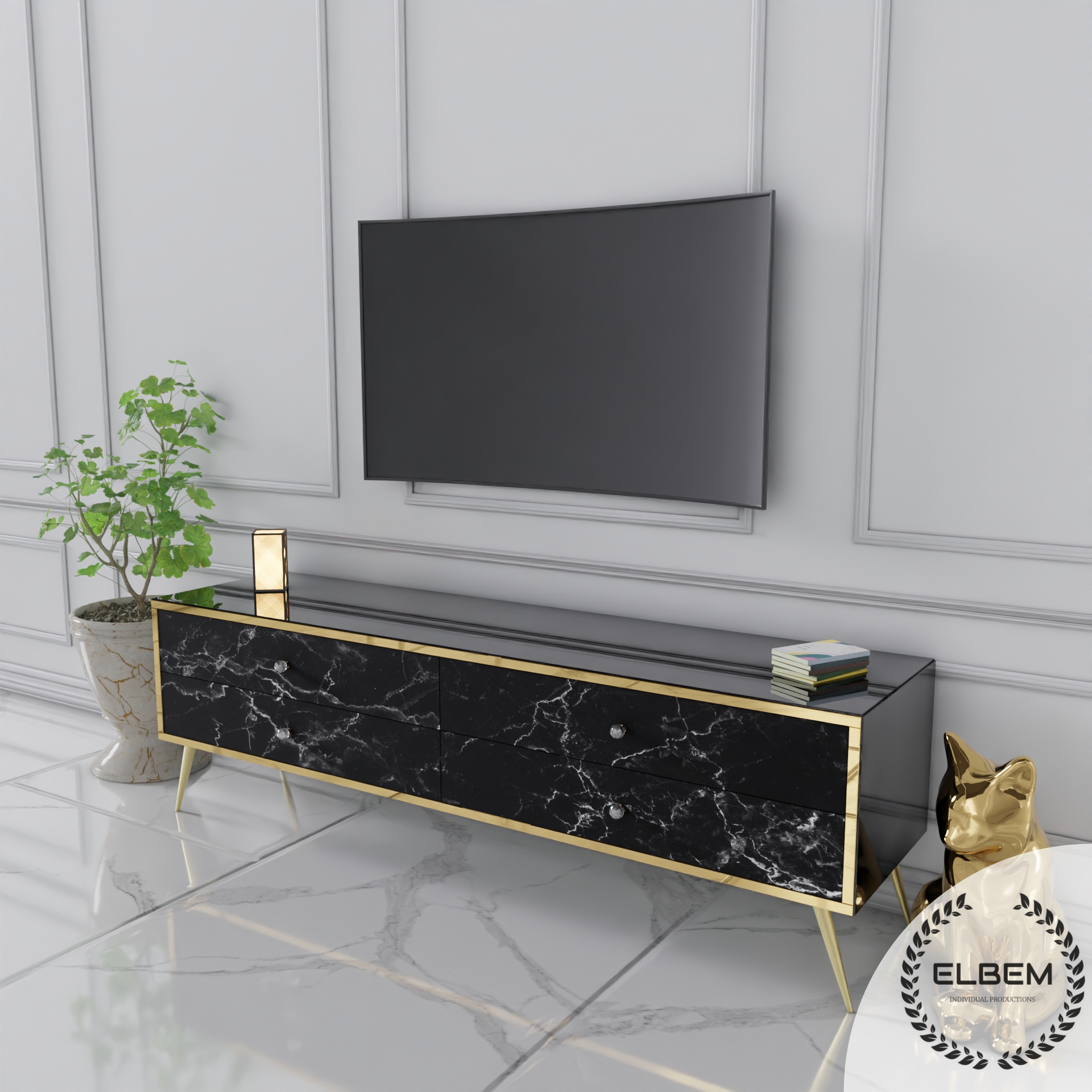Szklana czarna szafka RTV w stylu Glamour to elegancki i funkcjonalny element wyposażenia wnętrza, idealny dla miłośników luksusowych detali. Osadzona na smukłych skośnych nóżkach w złotym kolorze, przyciąga uwagę wyrafinowanym designem, który łączy nowoczesność z klasyką. Cienkie, złote lustrzane ramki subtelnie otaczają konstrukcję, dodając jej blasku i wyrafinowanego charakteru. Szafka posiada cztery pojemne szuflady, pokryte szkłem imitującym czarny marmur, co podkreśla jej ekskluzywny wygląd, a jednocześnie zapewnia praktyczną przestrzeń do przechowywania i organizacji.